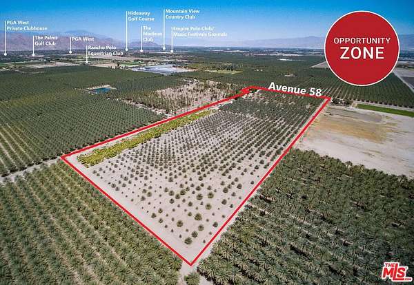 Welcome to a rare agricultural and investment opportunity in the heart of Thermal, California. Spanning 30 acres, this fully operational date ranch features approximately 1,100 mature trees producing Medjool dates and Deglet Noor dates, delivering annually providing long-term crop stability. The property is supported by its own private well and includes multiple functional structures, including a barn, offering flexible utility for storage, equipment, and ranch operations. Perfectly positioned for future growth, the ranch sits within a designated Opportunity Zone, making it ideal for investors seeking significant tax advantages alongside agricultural income. Just minutes away are some of the region's most iconic destinations, including the Coachella Valley Music and Arts Festival, the world-renowned Empire Polo Club, and luxury communities such as The Madison Club. High-profile estates and venues like Zenyara, Cavallo Ranch, and the acclaimed Desert International Horse Park are all close by, as is convenient access to Jacqueline Cochran Regional Airport. With its prime location, strong agricultural production, valuable water resources, and development-friendly zoning, this 30-acre date ranch represents an exceptional opportunity for farming, investment, or future vision. Perfect for agricultural operators, investors, or those seeking a strategic landholding near the Coachella Valley's most desirable destinations. Adjoining 20 acres is also available and Seller would prefer to sell both properties together.