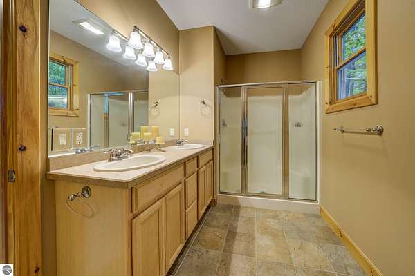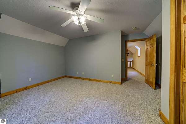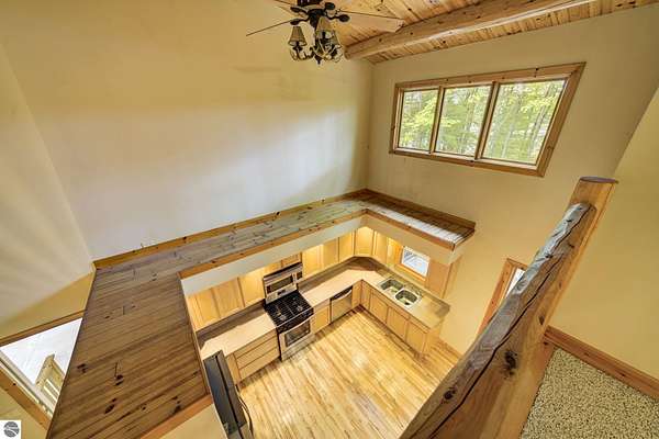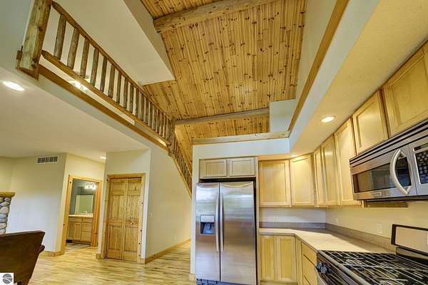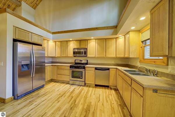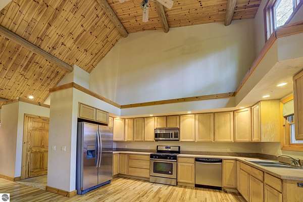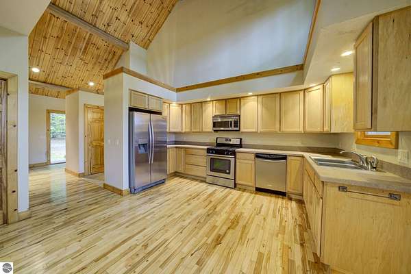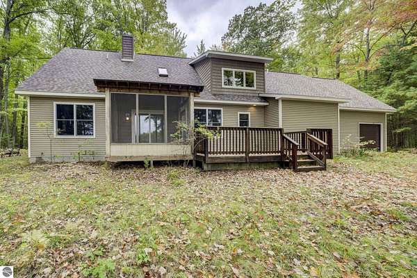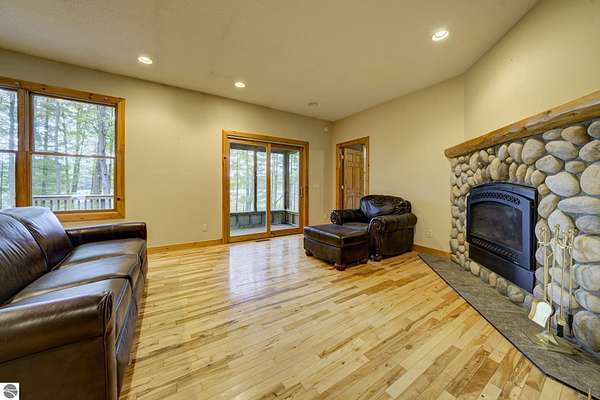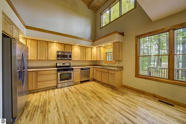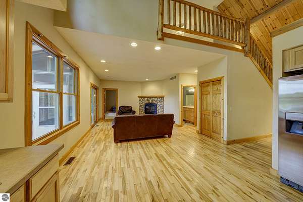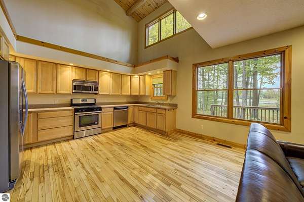 Private setting in Blue Heron subdivision with waterfront on Price Lake, a private small tranquil lake, within 30 minutes of Traverse City, Cadillac or Kalkaska. This home is 1.5 stories with the loft area overlooking the kitchen below. An open rustic floor plan with tri-birch flooring, ceilings and other touches. The kitchen has beautiful cabinetry, a pantry, stainless steel appliances and flows directly into the living area boasting a natural stone gas fireplace and the patio door access out to the screened in porch. The main floor has the primary ensuite with 2 separate walk-in closets. The private bath offers tiled floor & walk-in shower plus a water closet. The 2nd bedroom has the 2nd full bath adjacent to it, which is shared with the main level. Walking up to the large loft area you will find the additional 3rd bedroom with great closet space and the 3rd full bath adjacent to it, shared with the upper level. The finished 3-car garage has a pull through feature in the 3rd bay plus a 14.5 x 36 bonus room above the garage that is 95% finished for extra space to create whatever works for your needs. Heavily wooded waterfront lot with beautiful views of nature out your back door, year around!