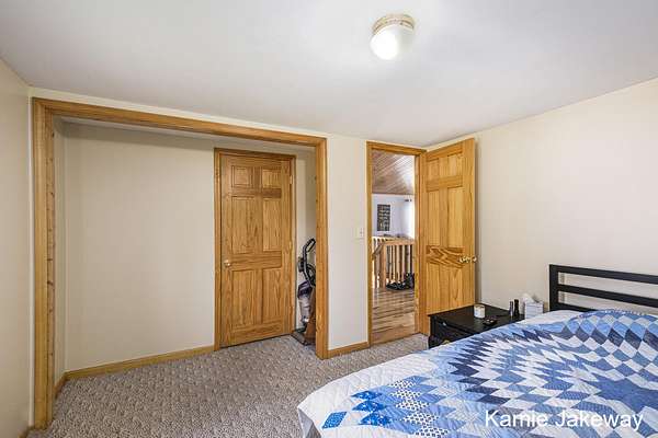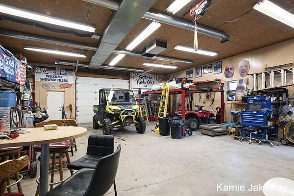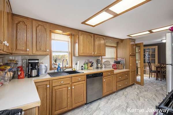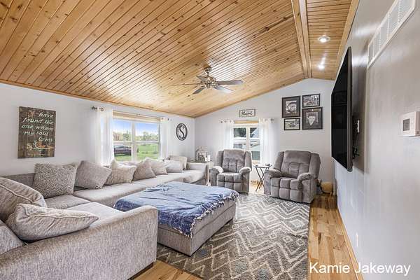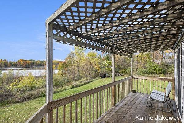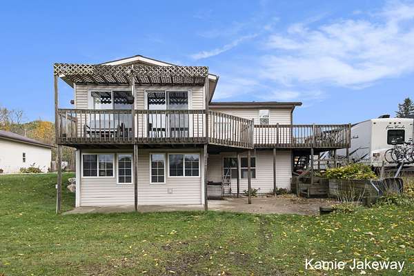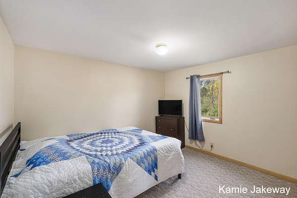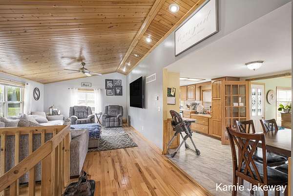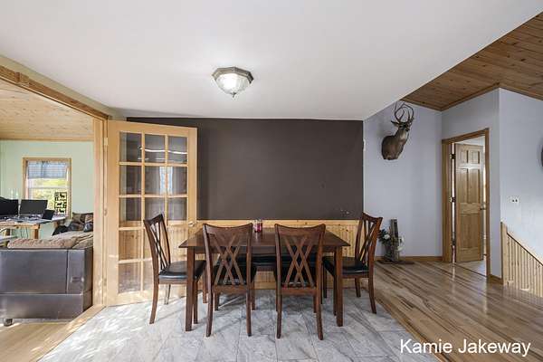 Raised walkout ranch on 4.05 acres with 294 ft of private frontage on East Twin Lake-a peaceful no-wake lake great for bass, perch, and bluegill fishing. The main floor offers a kitchen with hickory cabinets, stainless appliances, and new flooring that extends into the dining area with access to a 12x16 four-season room overlooking the lake and sliders to a wraparound deck. Hickory hardwood floors extend through the living room, connecting to the primary bedroom and full bath. The walkout level features all new flooring, 3 bedrooms, a brand-new full bathroom, laundry area, and another four-season room. Detached two-stall garage with 220 service plus three connected pole barns (40x36, 12x18, 30x36) with cement floors, 2 furnaces, water heater, 1/2 bath, 10x12 overhead door, and 220 power.