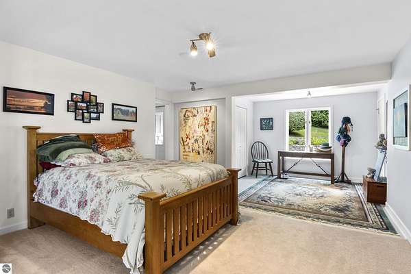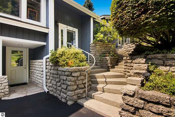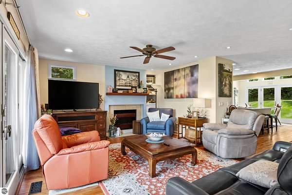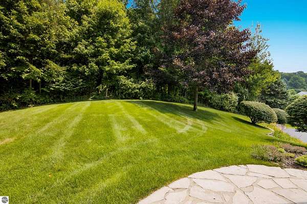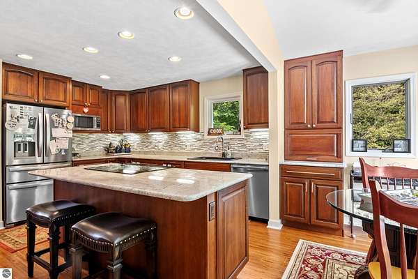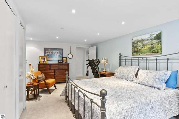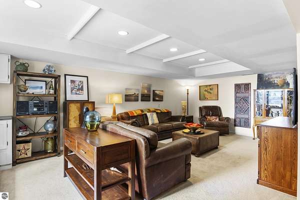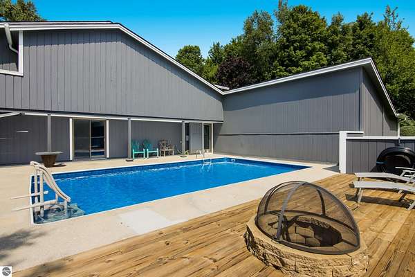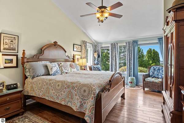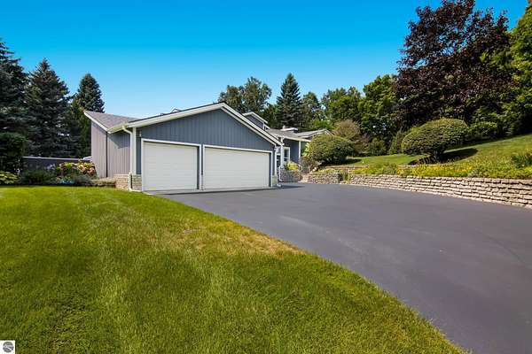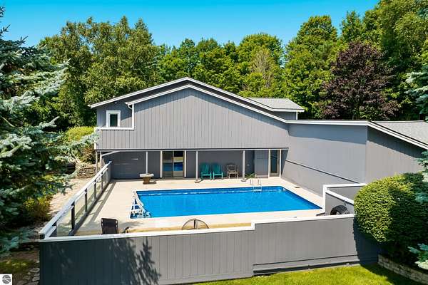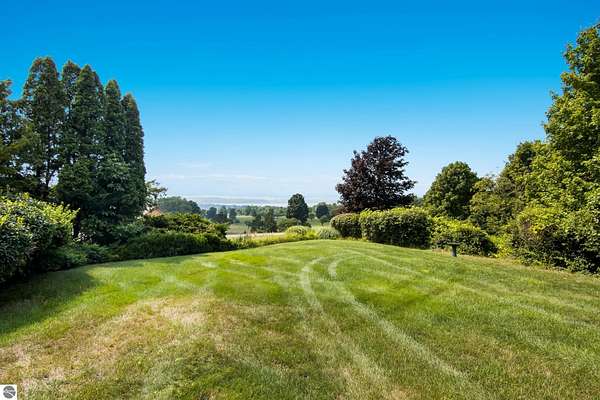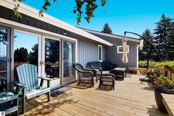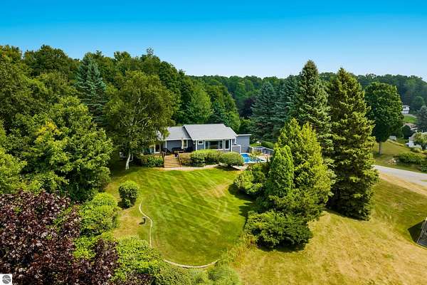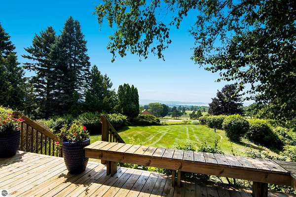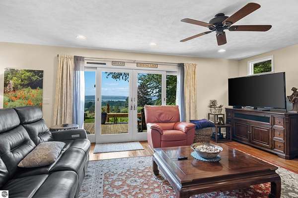 Beautiful view of Crystal Lake from this updated 4 BR home surrounded by a lush lawn and exceptional landscaping on 1.8 acres. Plenty of room here to invite guests, who will love the inground pool and the golf course just down the street. First of the homes many features is a new gourmet kitchen with granite counters, cooking island, and walk in pantry with skylight. A spectacular dining nook with vaulted ceiling is illuminated by floor-to-ceiling windows with views of nature. A separate dining area beside the kitchen can seat everyone. Lake and hilltop countryside views accentuate the living room with a cozy natural fireplace, built-in shelves, dry bar and doors lead out to the large deck to enjoy the sight of blue water and the green golf course. Main floor has not 1 but 2 bedroom suites, one with a lake view from your bed and custom private bath with double sinks and a looong walk-in closet. A 3rd BR includes an attractive office or library nook with window. Finished LL has a large 4th BR, craft room, game room, a sauna, and a spacious family room with tray ceiling, more built-ins and walkout access to the inground pool. Throughout the home are wood floors, recessed lighting, vaulted-ceiling accents and ceiling fans. Put your extra vehicle in the attached, finished, oversized garage. Whole house generator ensures power no matter what, and an extra storage area is ready for your equip. or gear. Walk or take your own cart down the street to the Crystal Lake Golf Club serving food and drink. Close to Beulah, Crystal Lake beaches and marinas. A short drive to Lake Michigan, the Sleeping Bear Dunes National Park and Crystal Mountain.