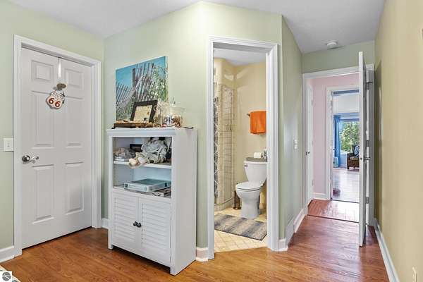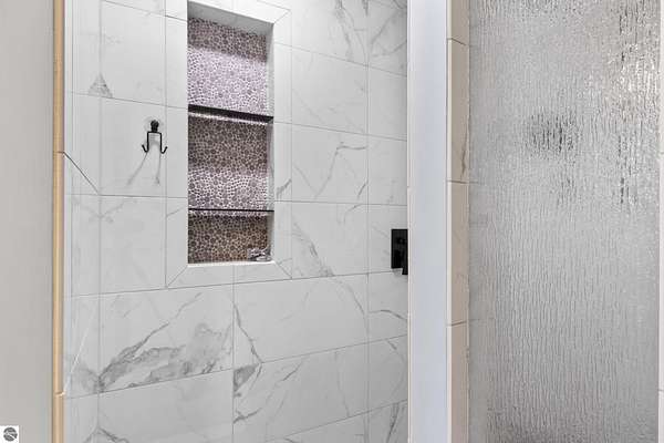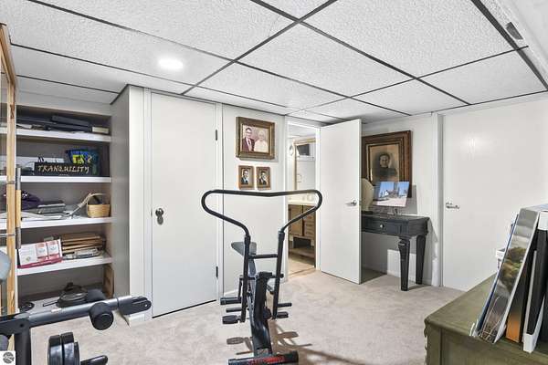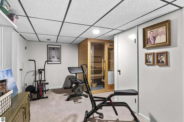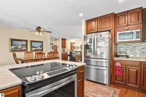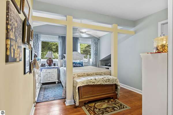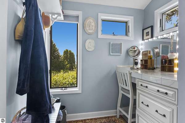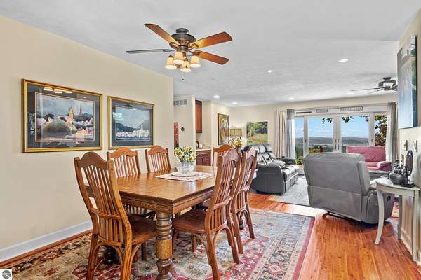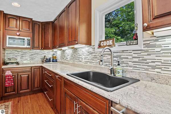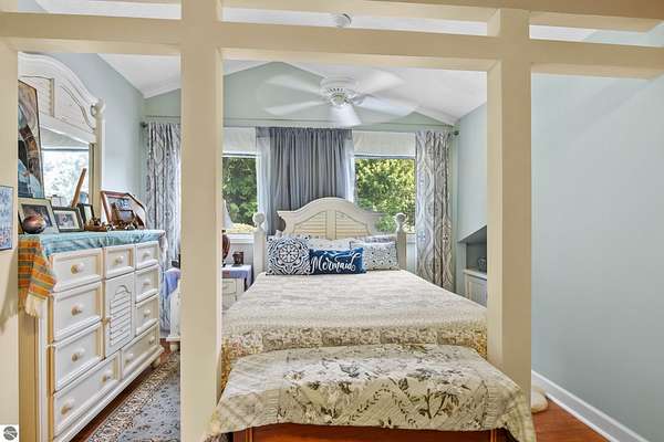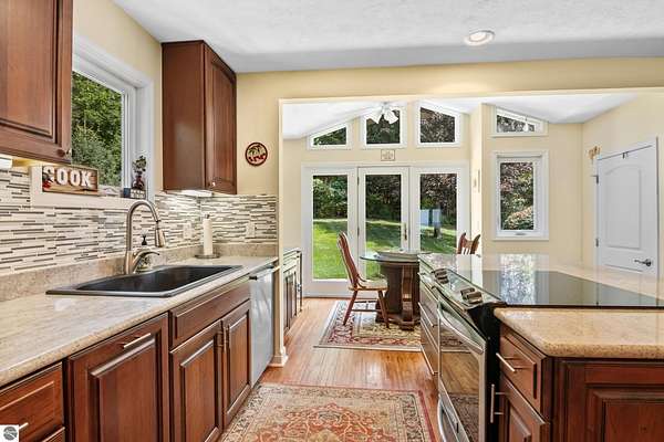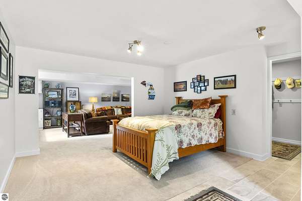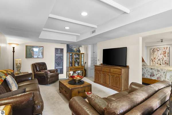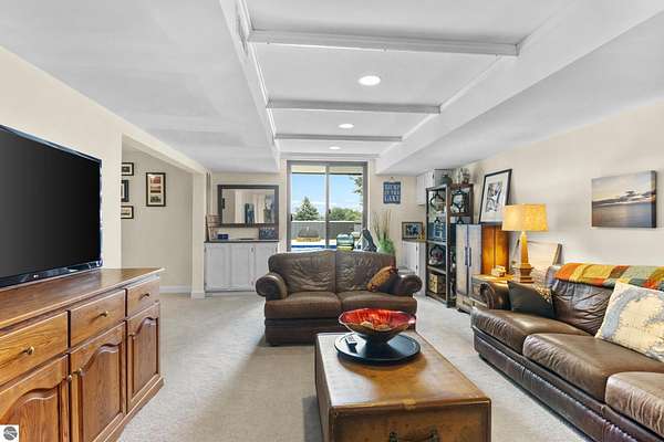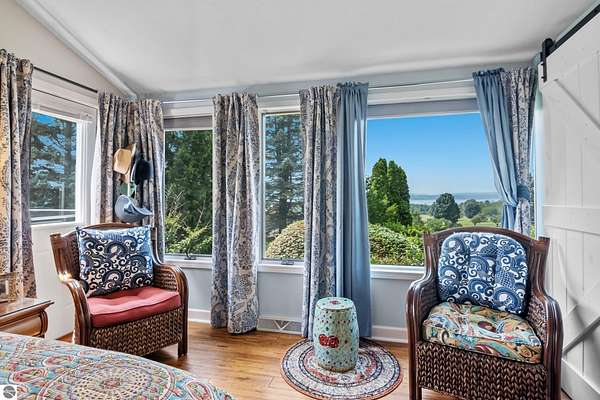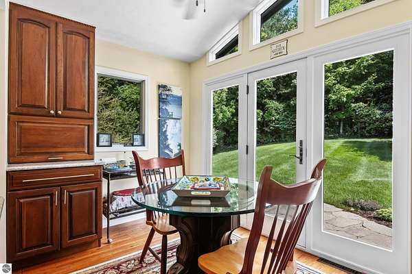 Beautiful view of Crystal Lake from this updated 4 BR home surrounded by a lush lawn and exceptional landscaping on 1.8 acres. Plenty of room here to invite guests, who will love the inground pool and the golf course just down the street. First of the homes many features is a new gourmet kitchen with granite counters, cooking island, and walk in pantry with skylight. A spectacular dining nook with vaulted ceiling is illuminated by floor-to-ceiling windows with views of nature. A separate dining area beside the kitchen can seat everyone. Lake and hilltop countryside views accentuate the living room with a cozy natural fireplace, built-in shelves, dry bar and doors lead out to the large deck to enjoy the sight of blue water and the green golf course. Main floor has not 1 but 2 bedroom suites, one with a lake view from your bed and custom private bath with double sinks and a looong walk-in closet. A 3rd BR includes an attractive office or library nook with window. Finished LL has a large 4th BR, craft room, game room, a sauna, and a spacious family room with tray ceiling, more built-ins and walkout access to the inground pool. Throughout the home are wood floors, recessed lighting, vaulted-ceiling accents and ceiling fans. Put your extra vehicle in the attached, finished, oversized garage. Whole house generator ensures power no matter what, and an extra storage area is ready for your equip. or gear. Walk or take your own cart down the street to the Crystal Lake Golf Club serving food and drink. Close to Beulah, Crystal Lake beaches and marinas. A short drive to Lake Michigan, the Sleeping Bear Dunes National Park and Crystal Mountain.