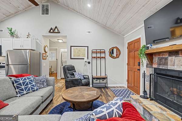 Discover serenity and peace in this beautifully fully renovated 2-bedroom, 1-bath cabin nestled on 2.12 private acres. Fully remodeled in 2020! It's completely move-in ready, featuring modern stainless steel appliances, sleek granite countertops, a handsome custom wood-burning fireplace, durable metal roof, central heat and air conditioning, plus fresh updates throughout-including flooring, walls, windows, electrical system, plumbing, and more. Enjoy ample fenced yard space perfect for your dogs' playful romps. Step outside to your own slice of paradise, where outdoor exploration awaits right from your doorstep. This delightful retreat sits conveniently close to the scenic Chattooga River at the Georgia-South Carolina bridge-ideal for rafting, hiking, fishing, and nature lovers. You're also just a short drive from vibrant downtown Clayton, famous for its excellent restaurants, unique shopping, and as the gateway to endless mountain adventures. Your peaceful mountain escape is calling!