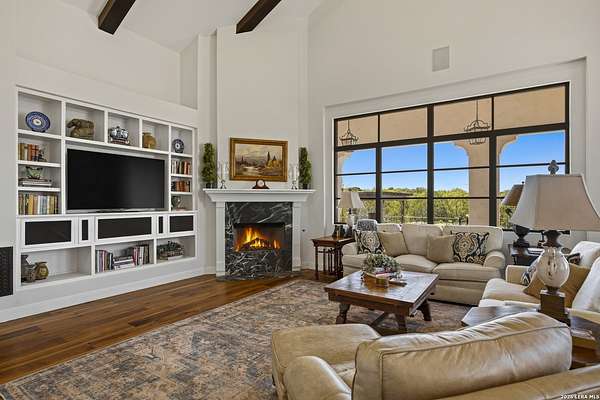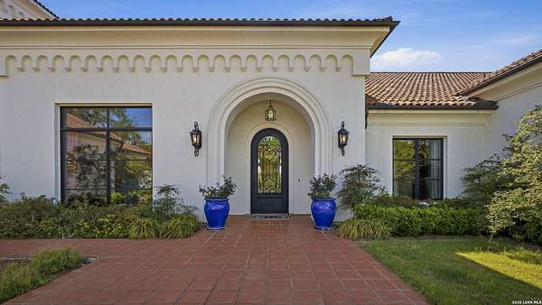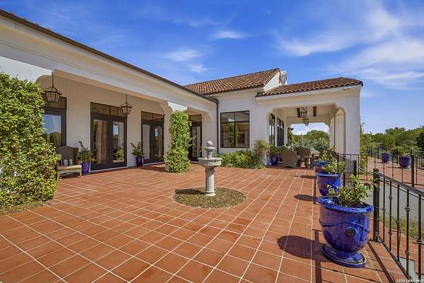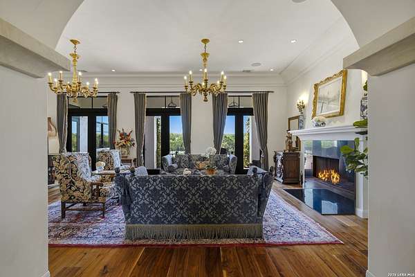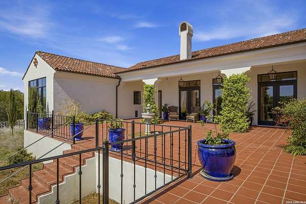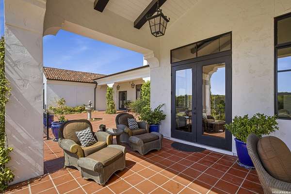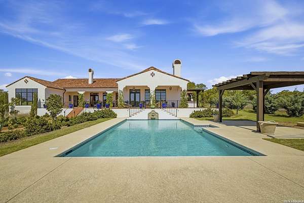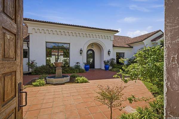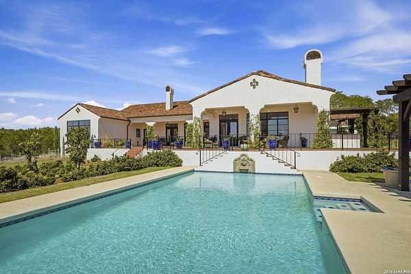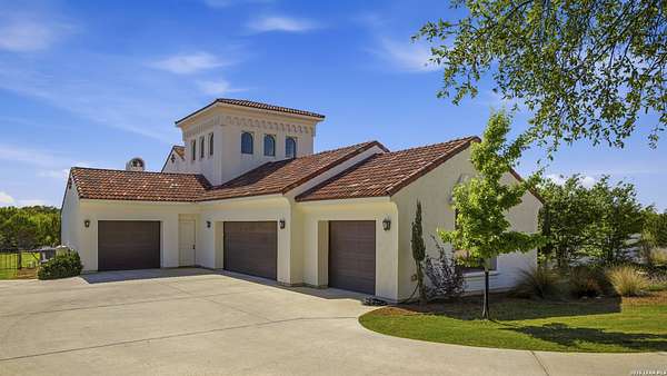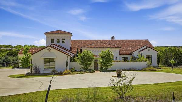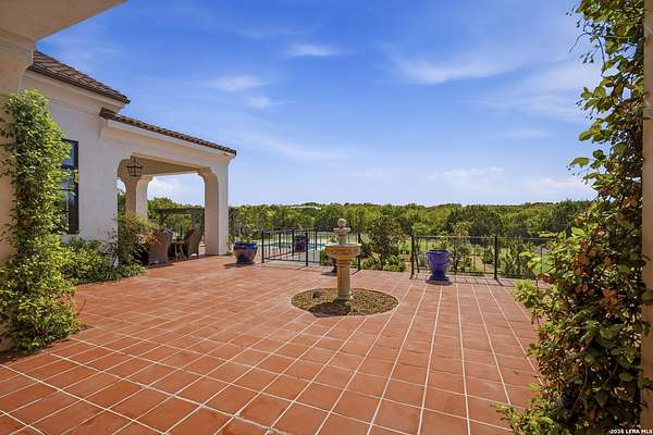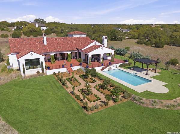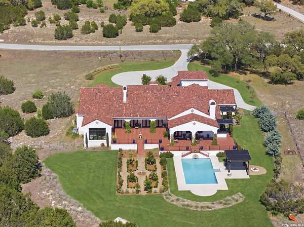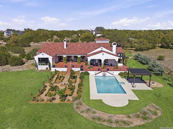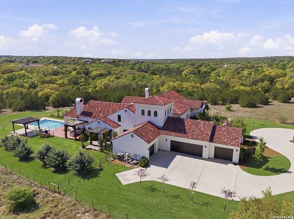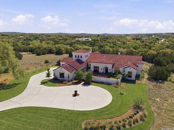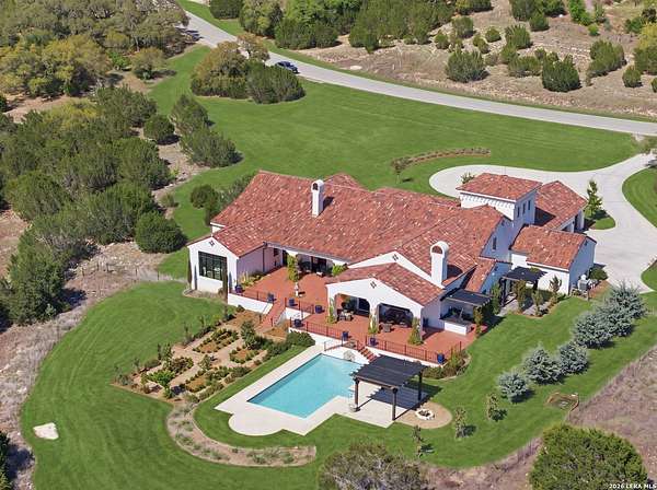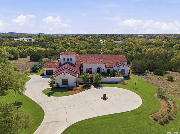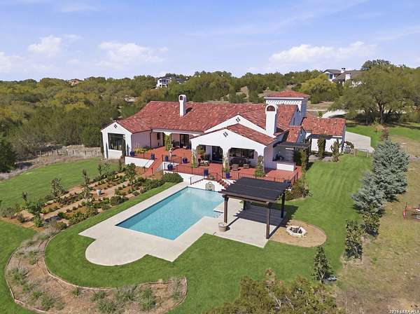 Nestled within the highly desirable Cordillera Ranch community, this stunning Spanish-style luxury estate sits on just over 2.5 acres, offering exceptional privacy surrounded by mature trees and natural beauty. As you enter the home, you're immediately welcomed by the first living area, where expansive views of your outdoor oasis set the tone. This inviting space features a fireplace and ample room for gathering, seamlessly blending indoor comfort with outdoor charm. To the left, a graceful gallery leads you past a separate formal dining room, perfect for hosting elegant dinners. Beyond, the home opens into a spectacular great room with an open-concept layout connecting the breakfast area, kitchen, and wet bar, complete with a sink and beverage refrigerator, creating an ideal setting for entertaining. The kitchen is a true centerpiece, featuring a large island, abundant cabinetry, double ovens, gas cooking, marble countertops, and a farmhouse sink perfectly positioned beneath a window overlooking the outdoors. A butler's pantry enhances functionality with a wine fridge, sink, and space for a second refrigerator, in addition to a separate walk-in pantry. On the opposite wing of the home, a cozy sitting room leads into the luxurious primary suite. This private retreat includes two walk-in closets and a spa-like bathroom with a garden tub, walk-in shower, and dual vanities. The main level also offers three additional bedrooms, each with walk-in closets, two connected by a Jack and Jill bathroom and one featuring its own en suite. Upstairs, you'll find a versatile hobby or craft room along with a spacious bonus room, ideal for a game room or additional living space. Step outside to your own private oasis, designed for both relaxation and entertaining. Expansive covered patios, an outdoor kitchen with a gas grill and sink, and a charming courtyard all overlook breathtaking views. The space continues with a step-down to a large pool, complete with a pergola and adjacent fire pit, as well as a whole garden for added tranquility. A separate patio pergola off the breakfast room offers yet another peaceful retreat. Additional features include a spacious laundry room, a 4-car attached garage, and abundant natural light throughout the home, enhancing its warm and inviting atmosphere. This remarkable property combines timeless Spanish architecture, thoughtful design, and serene surroundings to create a truly exceptional living experience.