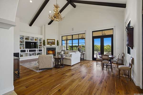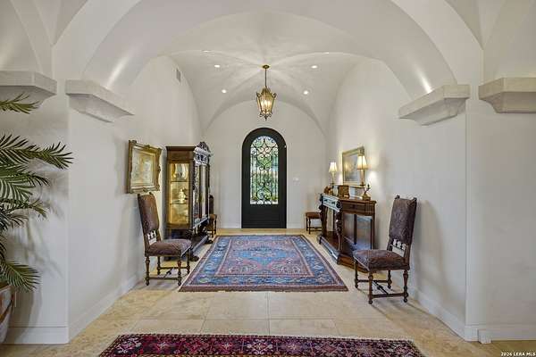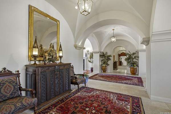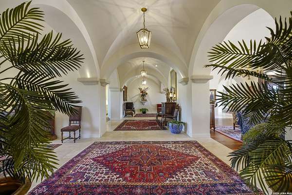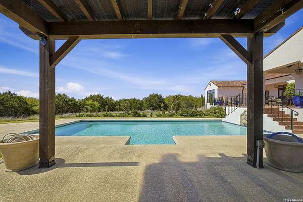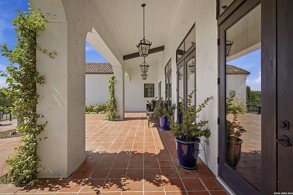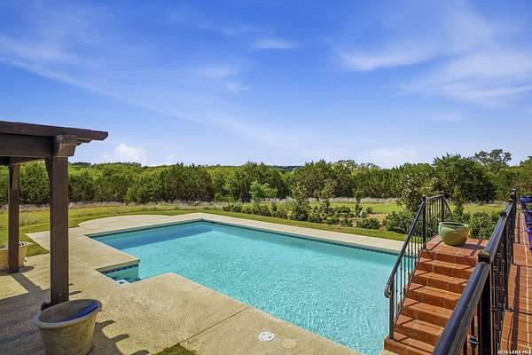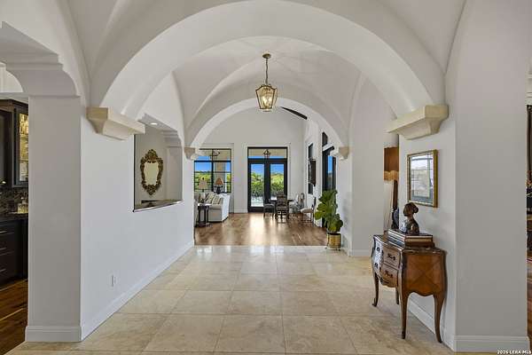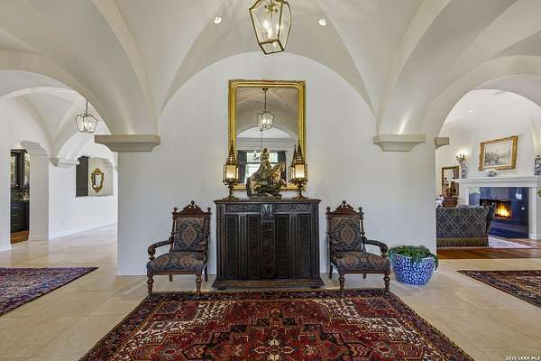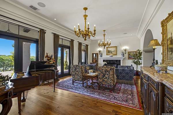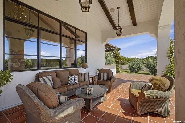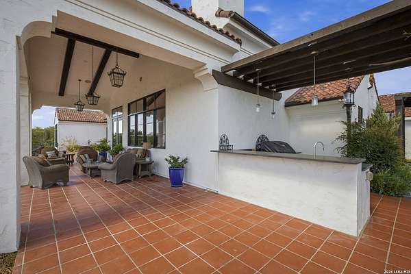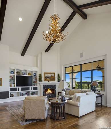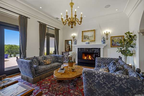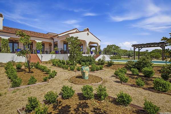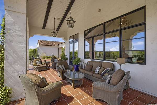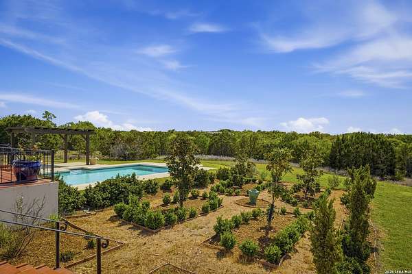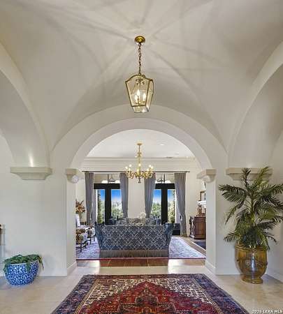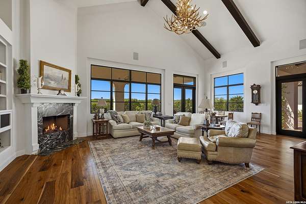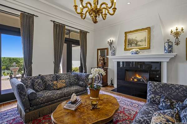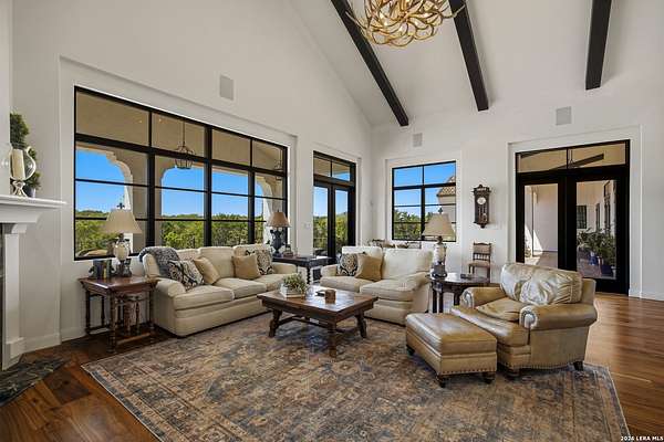 Nestled within the highly desirable Cordillera Ranch community, this stunning Spanish-style luxury estate sits on just over 2.5 acres, offering exceptional privacy surrounded by mature trees and natural beauty. As you enter the home, you're immediately welcomed by the first living area, where expansive views of your outdoor oasis set the tone. This inviting space features a fireplace and ample room for gathering, seamlessly blending indoor comfort with outdoor charm. To the left, a graceful gallery leads you past a separate formal dining room, perfect for hosting elegant dinners. Beyond, the home opens into a spectacular great room with an open-concept layout connecting the breakfast area, kitchen, and wet bar, complete with a sink and beverage refrigerator, creating an ideal setting for entertaining. The kitchen is a true centerpiece, featuring a large island, abundant cabinetry, double ovens, gas cooking, marble countertops, and a farmhouse sink perfectly positioned beneath a window overlooking the outdoors. A butler's pantry enhances functionality with a wine fridge, sink, and space for a second refrigerator, in addition to a separate walk-in pantry. On the opposite wing of the home, a cozy sitting room leads into the luxurious primary suite. This private retreat includes two walk-in closets and a spa-like bathroom with a garden tub, walk-in shower, and dual vanities. The main level also offers three additional bedrooms, each with walk-in closets, two connected by a Jack and Jill bathroom and one featuring its own en suite. Upstairs, you'll find a versatile hobby or craft room along with a spacious bonus room, ideal for a game room or additional living space. Step outside to your own private oasis, designed for both relaxation and entertaining. Expansive covered patios, an outdoor kitchen with a gas grill and sink, and a charming courtyard all overlook breathtaking views. The space continues with a step-down to a large pool, complete with a pergola and adjacent fire pit, as well as a whole garden for added tranquility. A separate patio pergola off the breakfast room offers yet another peaceful retreat. Additional features include a spacious laundry room, a 4-car attached garage, and abundant natural light throughout the home, enhancing its warm and inviting atmosphere. This remarkable property combines timeless Spanish architecture, thoughtful design, and serene surroundings to create a truly exceptional living experience.