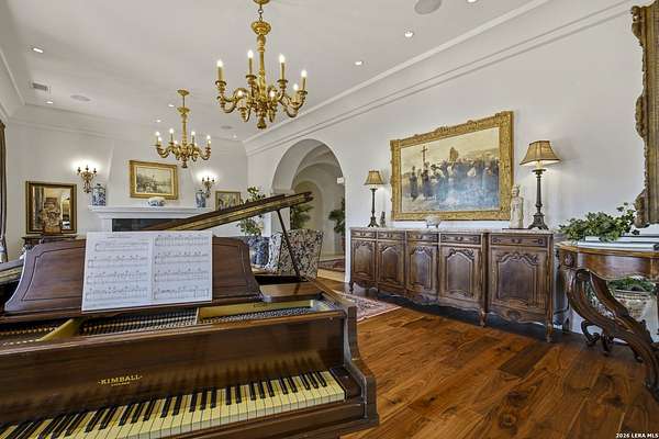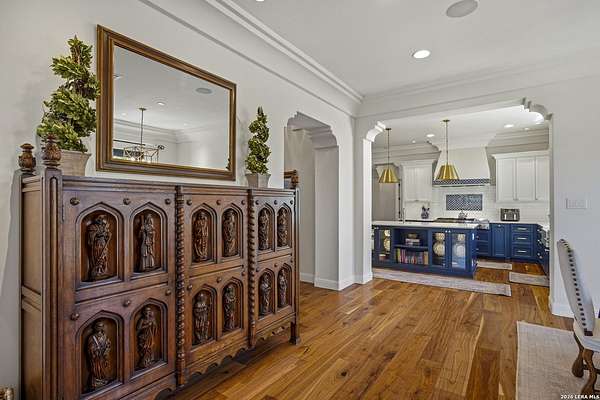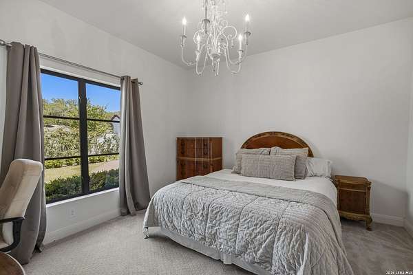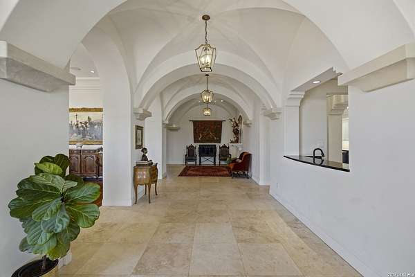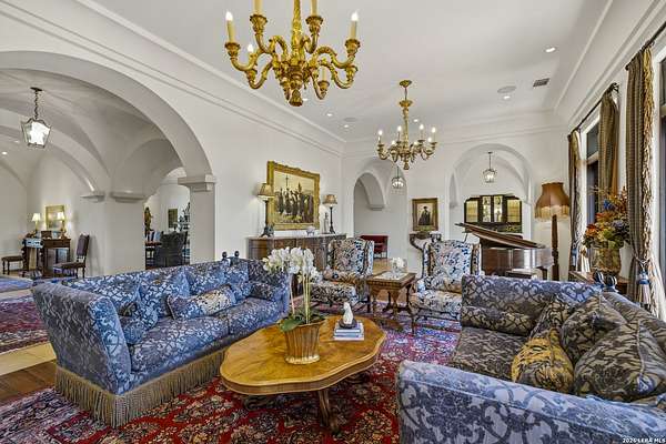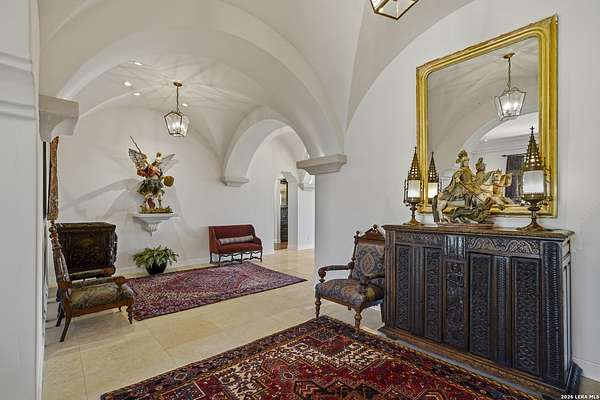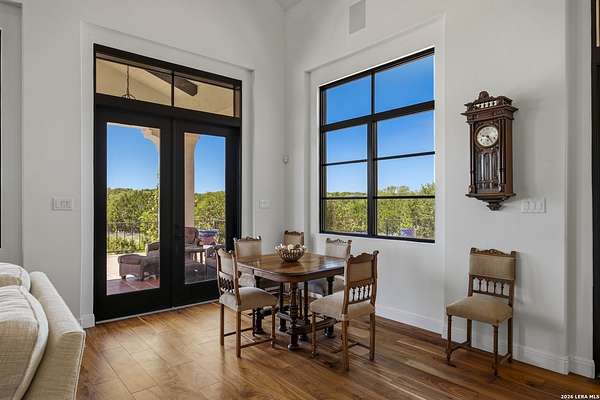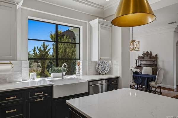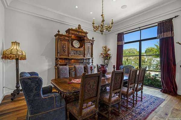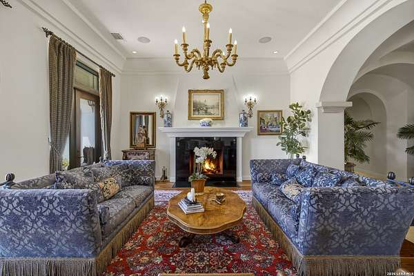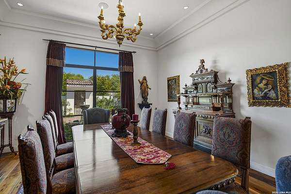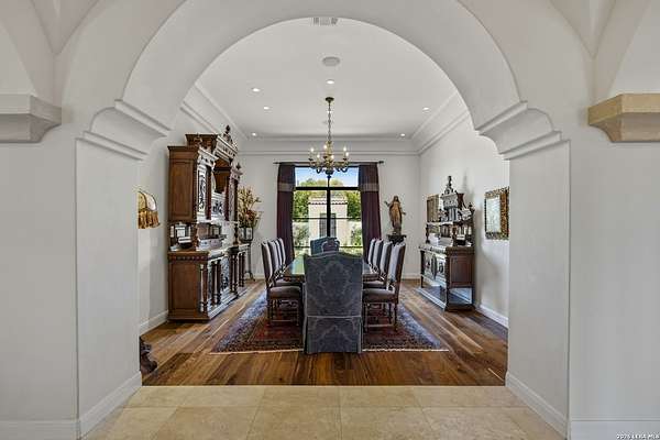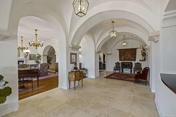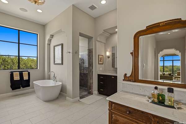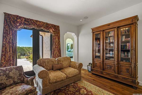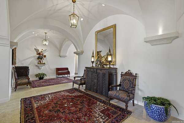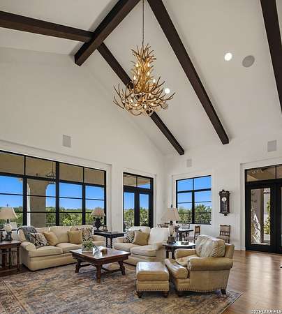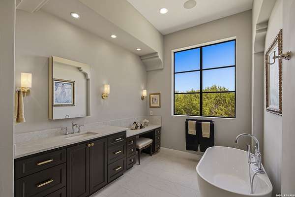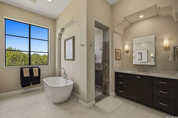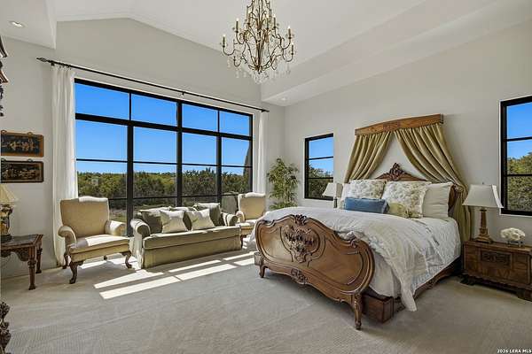 Nestled within the highly desirable Cordillera Ranch community, this stunning Spanish-style luxury estate sits on just over 2.5 acres, offering exceptional privacy surrounded by mature trees and natural beauty. As you enter the home, you're immediately welcomed by the first living area, where expansive views of your outdoor oasis set the tone. This inviting space features a fireplace and ample room for gathering, seamlessly blending indoor comfort with outdoor charm. To the left, a graceful gallery leads you past a separate formal dining room, perfect for hosting elegant dinners. Beyond, the home opens into a spectacular great room with an open-concept layout connecting the breakfast area, kitchen, and wet bar, complete with a sink and beverage refrigerator, creating an ideal setting for entertaining. The kitchen is a true centerpiece, featuring a large island, abundant cabinetry, double ovens, gas cooking, marble countertops, and a farmhouse sink perfectly positioned beneath a window overlooking the outdoors. A butler's pantry enhances functionality with a wine fridge, sink, and space for a second refrigerator, in addition to a separate walk-in pantry. On the opposite wing of the home, a cozy sitting room leads into the luxurious primary suite. This private retreat includes two walk-in closets and a spa-like bathroom with a garden tub, walk-in shower, and dual vanities. The main level also offers three additional bedrooms, each with walk-in closets, two connected by a Jack and Jill bathroom and one featuring its own en suite. Upstairs, you'll find a versatile hobby or craft room along with a spacious bonus room, ideal for a game room or additional living space. Step outside to your own private oasis, designed for both relaxation and entertaining. Expansive covered patios, an outdoor kitchen with a gas grill and sink, and a charming courtyard all overlook breathtaking views. The space continues with a step-down to a large pool, complete with a pergola and adjacent fire pit, as well as a whole garden for added tranquility. A separate patio pergola off the breakfast room offers yet another peaceful retreat. Additional features include a spacious laundry room, a 4-car attached garage, and abundant natural light throughout the home, enhancing its warm and inviting atmosphere. This remarkable property combines timeless Spanish architecture, thoughtful design, and serene surroundings to create a truly exceptional living experience.
