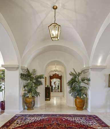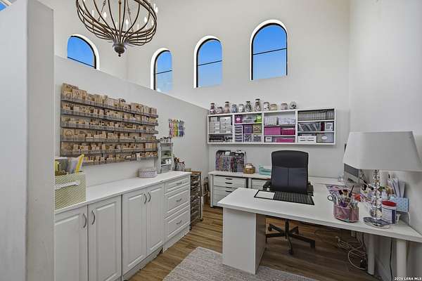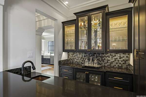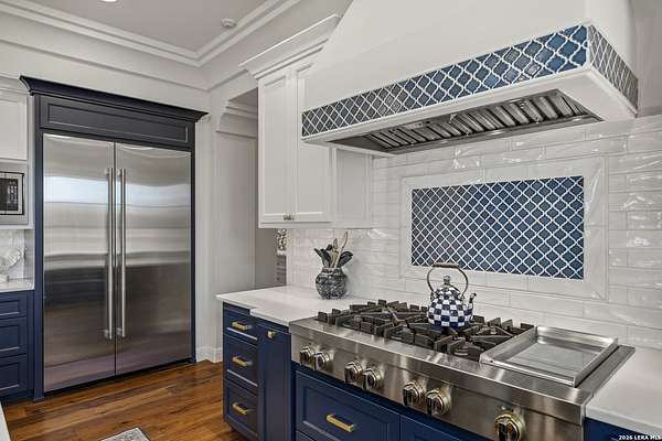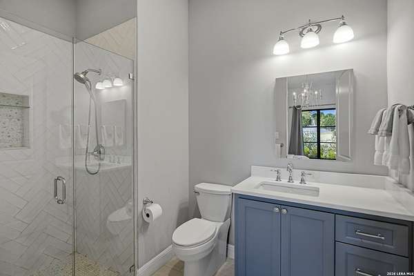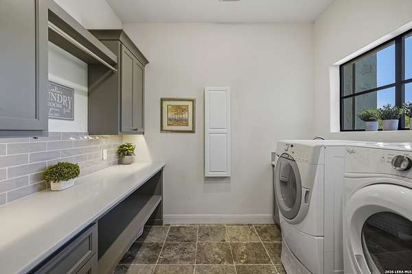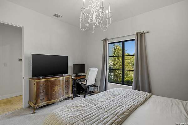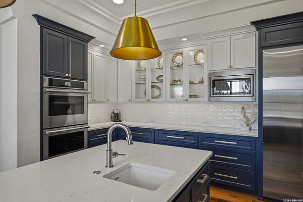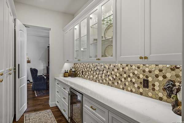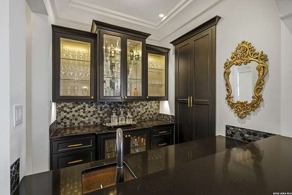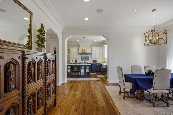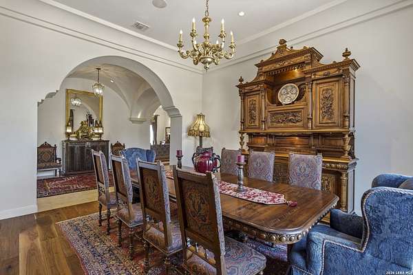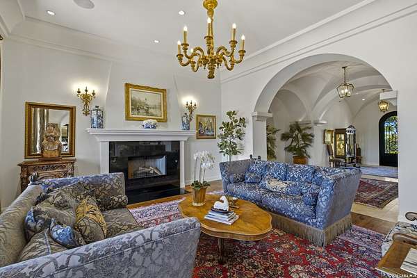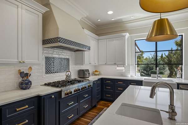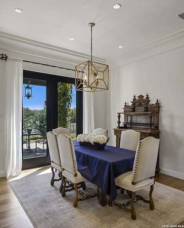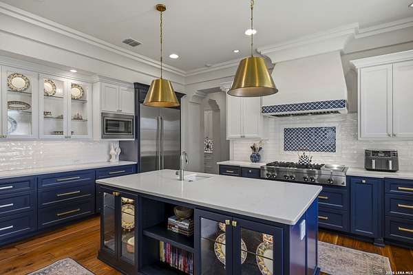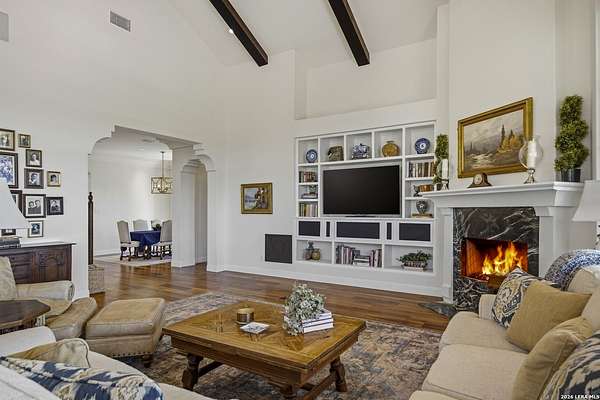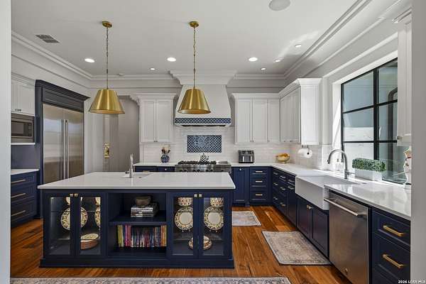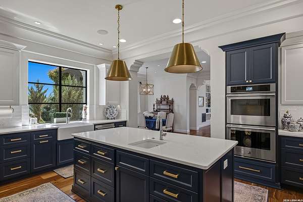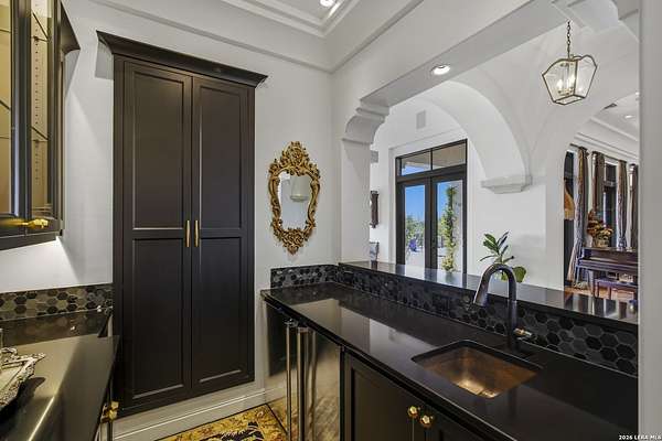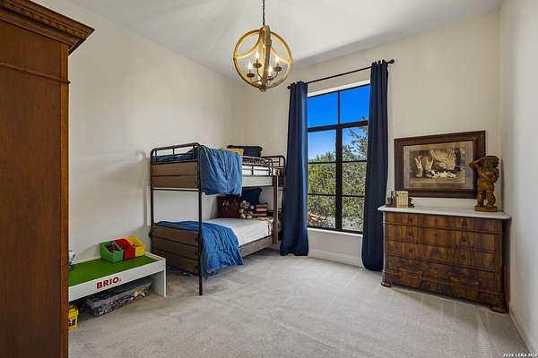 Nestled within the highly desirable Cordillera Ranch community, this stunning Spanish-style luxury estate sits on just over 2.5 acres, offering exceptional privacy surrounded by mature trees and natural beauty. As you enter the home, you're immediately welcomed by the first living area, where expansive views of your outdoor oasis set the tone. This inviting space features a fireplace and ample room for gathering, seamlessly blending indoor comfort with outdoor charm. To the left, a graceful gallery leads you past a separate formal dining room, perfect for hosting elegant dinners. Beyond, the home opens into a spectacular great room with an open-concept layout connecting the breakfast area, kitchen, and wet bar, complete with a sink and beverage refrigerator, creating an ideal setting for entertaining. The kitchen is a true centerpiece, featuring a large island, abundant cabinetry, double ovens, gas cooking, marble countertops, and a farmhouse sink perfectly positioned beneath a window overlooking the outdoors. A butler's pantry enhances functionality with a wine fridge, sink, and space for a second refrigerator, in addition to a separate walk-in pantry. On the opposite wing of the home, a cozy sitting room leads into the luxurious primary suite. This private retreat includes two walk-in closets and a spa-like bathroom with a garden tub, walk-in shower, and dual vanities. The main level also offers three additional bedrooms, each with walk-in closets, two connected by a Jack and Jill bathroom and one featuring its own en suite. Upstairs, you'll find a versatile hobby or craft room along with a spacious bonus room, ideal for a game room or additional living space. Step outside to your own private oasis, designed for both relaxation and entertaining. Expansive covered patios, an outdoor kitchen with a gas grill and sink, and a charming courtyard all overlook breathtaking views. The space continues with a step-down to a large pool, complete with a pergola and adjacent fire pit, as well as a whole garden for added tranquility. A separate patio pergola off the breakfast room offers yet another peaceful retreat. Additional features include a spacious laundry room, a 4-car attached garage, and abundant natural light throughout the home, enhancing its warm and inviting atmosphere. This remarkable property combines timeless Spanish architecture, thoughtful design, and serene surroundings to create a truly exceptional living experience.