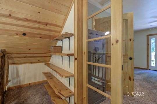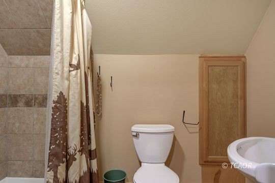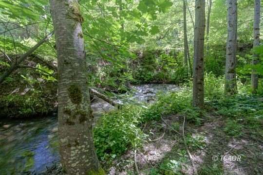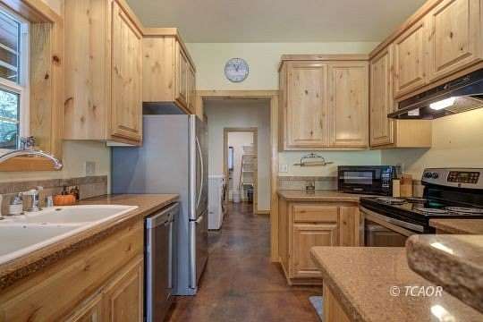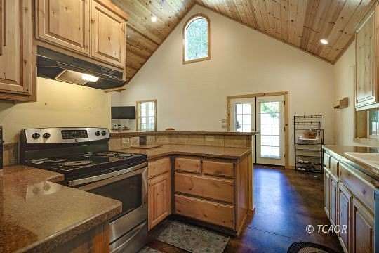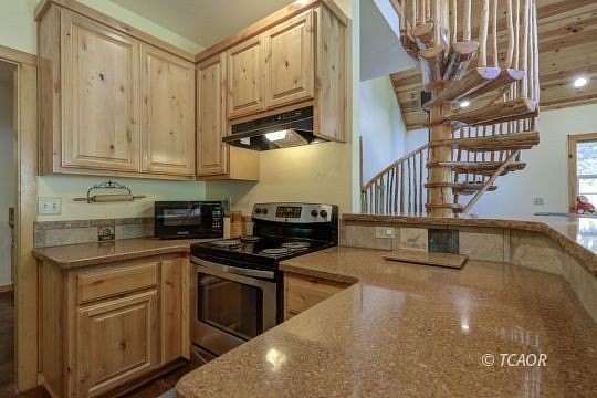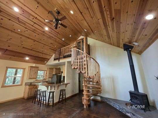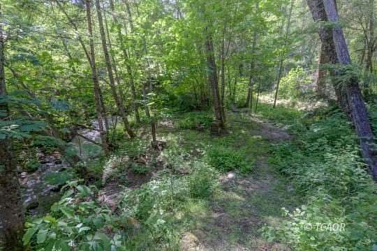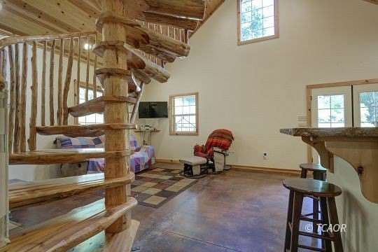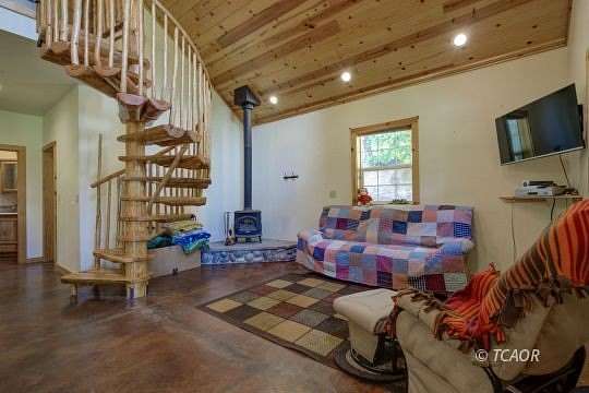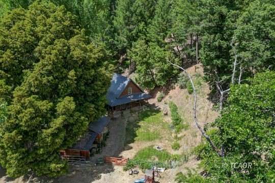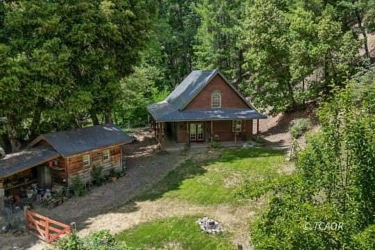 Discover this one-of-a-kind custom-built two-story home nestled on 9.62 serene acres along a year-round creek. This thoughtfully designed 2-bedroom, 2-bath residence blends rustic charm with modern comfort, featuring radiant heated stained concrete floors throughout, vaulted ceilings, and warm knotty pine accents including a stunning spiral staircase. The chef's kitchen offers custom wood cabinetry, stainless steel appliances, and striking quartz live-edge countertops. A guest bathroom boasts a jetted tub and separate walk-in shower, while the private upstairs primary suite includes a full bath, walk-in closet, a loft space, and a balcony overlooking the backyard and tranquil creek. Cozy up to the woodstove or enjoy the convenience of electric heat. Outdoor living shines with covered concrete patios on two sides, large fenced yards, and a powered workshop with extra storage. The property also includes an orchard, chicken coop, small pond, and space for animals-your perfect retreat awaits. (2/2 newer manufactured home across creek also for sale by same owner)