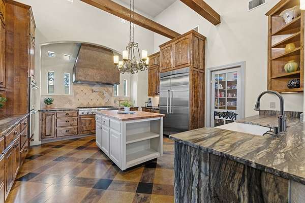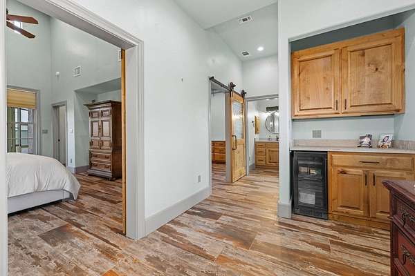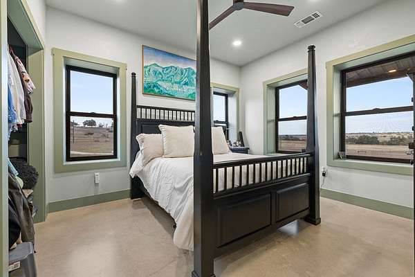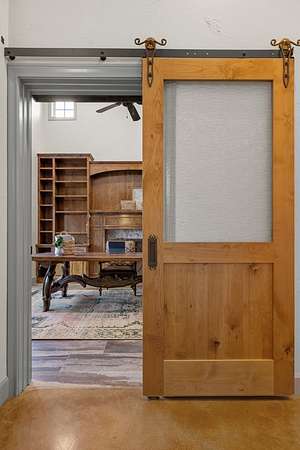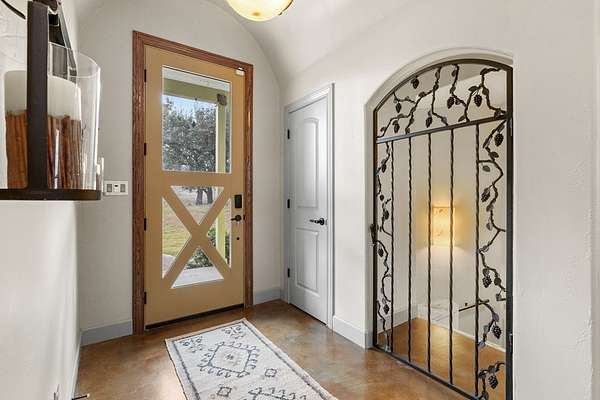 Welcome to your dream oasis, situated on over 14 acres of serene, gated estate, just a quick 15-minute drive from Fredericksburg, TX Main St. This expansive 2,943-square-foot main home boasts breathtaking panoramic views of the rolling hill country, masterfully blending privacy with sophisticated style. The property, open to livestock, features a striking 60x60 ft fully insulated barn with three spacious bays and comprehensive RV hookups. Complementing this is an attached 572 sq ft fully equipped guest house-- thoughtfully designed for wheelchair accessibility -- which can serve as cozy living quarters. A separate livestock pole barn and a charming greenhouse lie nearby, adding to the estate's unique charm. Inside the main house, you will find an open concept living and dining room. Which offers vaulted ceilings, exposed beams, and a custom gorgeous kitchen. Features to the kitchen include stainless steel Thermador appliances, walk in pantry, and custom quartz countertops. The private primary en suite serves as a tranquil retreat, complete with a generous custom closet, dual sinks, and a luxurious walk-in shower. Two additional bedrooms offer comfort and style, while a dedicated office, furnished with a custom library, provides a sophisticated workspace. Above the garage, a fully finished bonus/game room awaits, offering ample space for recreation or relaxation. Throughout the home, updated flooring provides a fresh and modern touch, and the laundry room is outfitted with built-in storage, a convenient folding area, and a utility sink to enhance functionality. Step outside to discover a beautifully screened-in porch, featuring a pass-through fireplace and wet bar, leading to an expansive deck. This outdoor haven is ideal for entertaining, allowing you to unwind in a swim spa while soaking in the stunning vistas. With twinkle lighting designed to adhere to dark sky ordinances, this estate offers a rare opportunity to experience luxurious living amidst the tranquility of nature. Seize the chance to own this extraordinary property, a perfect retreat for both relaxation and entertaining.
