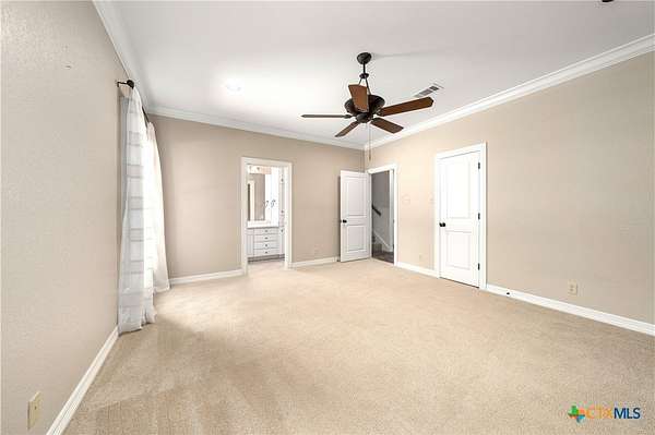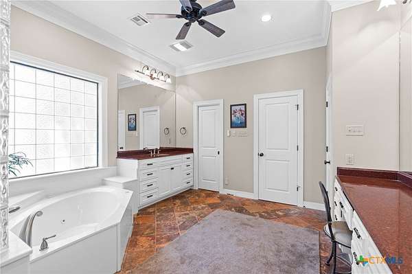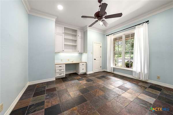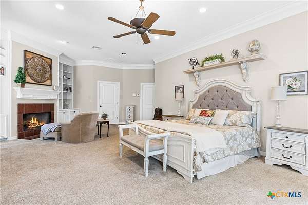 - All Bedrooms Down, Bookcases, Breakfast Bar, Built In Features, Ceiling Fans, Chandelier, Crown Molding, Dining Area, Entrance Foyer, Game Room, High Ceilings, Home Office, Jetted Tub, Main Level Primary, Multiple Closets, Multiple Dining Areas, Open Floorplan, Primary Downstairs, Recessed Lighting, Separate Formal Dining Room, Separate Shower