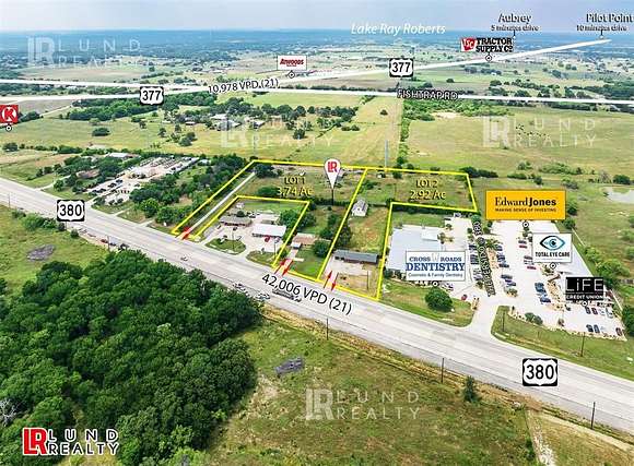 Lund Realty is proud to present a FANTASTIC INVESTMENT OPPORTUNITY ON HWY 380! - ONE OF THE LAST REMAINING. Nearly 3 Acres Infill Commercial Lot at the bustling U.S. Hwy 380, Offers a Prime Location Between Major Intersections, with direct access Onto Highly Trafficked U.S. Hwy 380 ensures high visibility and sees approximately 41,214 vehicles per day. With a Strong Mixture of Major National Retailers like Wal-Mart, Future HEB, Starbucks, McDonald's, CVS, Bank of America, and many more. With Mixed Commercial Zoning, Level Topography, and OUTSIDE of 'Project Alpha' Zoning Overlay, This Site Would be Suitable for Multiple Business Uses or Retail Development. Please inquire with the broker for further information. Water line is at the street and wastewater is nearby. An additional 3.74 Acres are available. This offering is for Lot 2 only. Includes two buildings, approx. 2203 sq. ft. main building and an additional two-story building in the back with 110*220 electric 1500 sq. f. upstairs, converted to an office or storage area.