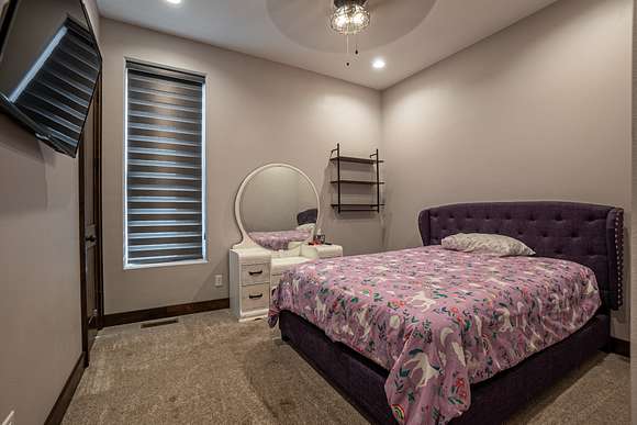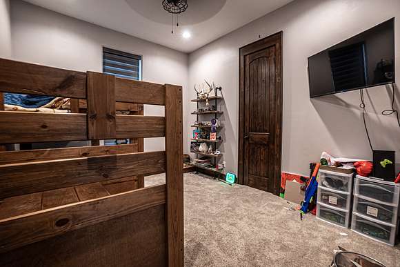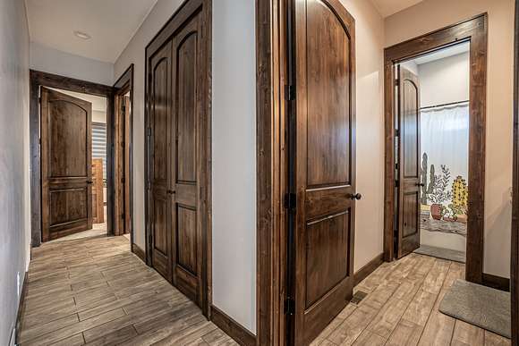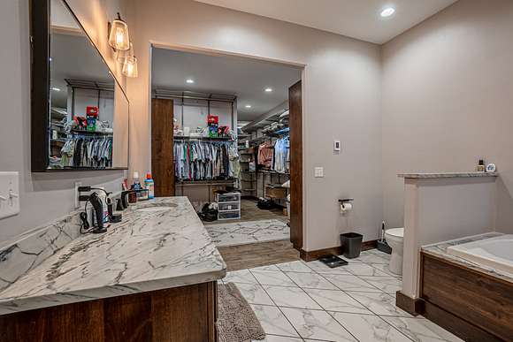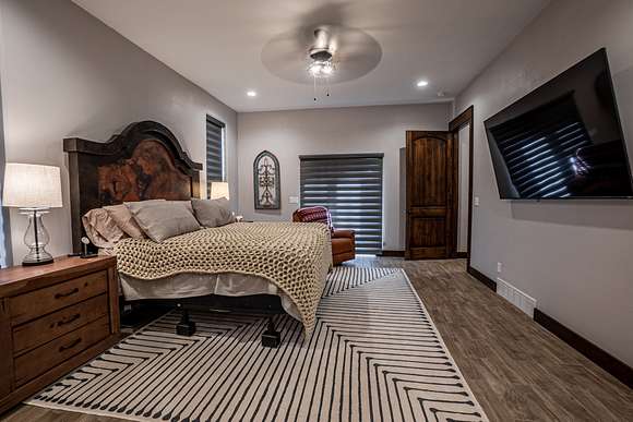 The master suite is a true retreat, complete with heated floors, a jacuzzi tub, a floor-to-ceiling tiled walk-in shower with a rain head, and an oversized walk-in closet with a built-in gun safe and direct access to a laundry room equipped with two washers, two dryers, and a dog bath. The 1,200 sq. ft. 3-car garage features 8-ft tall doors, accommodating pickups with ease. Comfort is guaranteed year-round with two A/C units, two furnaces, and a whole-home generator powered by its own 500-gallon propane tank. Thoughtfully designed for both efficiency and elegance, this home is the ultimate modern ranch retreat.