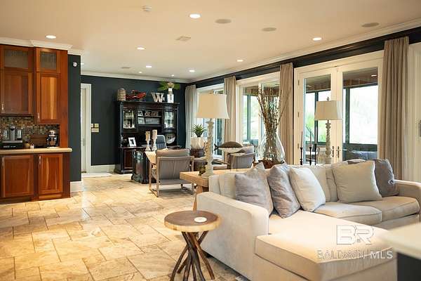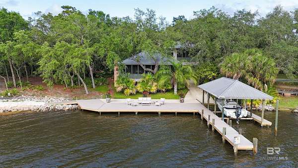 Escape to your own Private Paradise! A 1.8 acre Waterfront Estate tucked away on a hidden cove just off of Wolf Bay with 130 ft of frontage on Hammock Bay complete with Bulkhead and Mature Live Oaks and natural landscaping for easy maintenance! This 5000sqft home welcomes you with Cypress Board & Batten siding & large porches made of Old Chicago Brick accented with Antique cast iron columns. Entering the home you find an open living area with Travertine floors and tall windows with wide views of Hammock Bay and the Nature Preserve across the water. Your Chefs Kitchen has Cherry Cabinetry, Premium Appliances and a convenient wet bar with ice maker. Grab your refreshing beverage and step out through the French doors onto a sprawling screened porch with a dining area at one end and fireplace and sitting area at the other. Upstairs you will find Bamboo Flooring leading you to the Primary Suite with tall ceilings, a private balcony overlooking the Bay, a Primary Bath with a jetted soaking Tub and a walk-in Shower, all along with an expansive walk in closet. Down the Hallway is the guest suite complete with living room, Kitchen, bedroom and bath along with a separate entrance for your guests to come and go. Back downstairs you have two additional guest rooms hidden off of the living area along with a guest bath. On the other side of the living area are exits leading to your outdoor entertaining areas, a half bath for your company convenience and your laundry suite & Garage. Your two car garage has Carriage doors on both the street side and the water side of the house. The waterside port has a ramp leading down to your boat slip for easy launching of Kayaks and Paddleboards with a dock and sprawling sundeck offering ample space to relax and entertain as the dolphins, otters and other flora and fauna frolic and play. A detached Carriage house has more vehicle storage along with an office and a fitness center. All Just a relaxing boat ride away from Dining Venues!