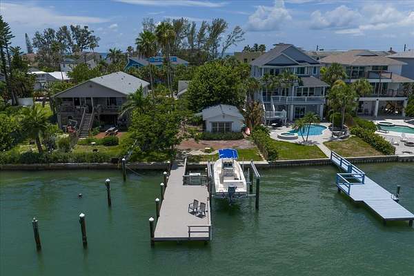 If you have been waiting for a magical waterfront location to build your future dream home, you may have just found it. Blind Pass Waterfront Property on Sunset Beach located just steps from the sand. Currently the property includes two separate buildings, a Main House(2 Bed/2Bath) & a Detached Cottage(1 Bed). What makes this lot so SPECIAL? Located a short walk from the beach, this lot has wide dynamic views of Smuggler's Cove, Blind Pass Waterway to the North and Blind Pass Waterway to the South. A newly constructed elevated home at this location could have Incredible views in all directions of Blind Pass Waterway & the Beach. The aerial video illustrates the beauty of this very special location. The 50-foot-long dock with a 20x30 ft. platform, is big enough for entertaining. It was reinforced with extra poles so that no span is greater than 10 foot long. The 10,000 lb. boat lift was positioned so that when the boat is up on the lift, the beautiful view of the pass is not blocked in either direction. The owner being previously a sailor, placed the dock & lift to allow room for a sailboat (4.5-foot draft) on the other side. There are no bridges going out to the Gulf, less than a mile away. There are plenty of restaurants & marinas accessible by boat. A boater's paradise with plenty of sandy islands to drop anchors on the weekend. Egmont Key, a bird sanctuary at the mouth of Tampa Bay, is only about 20 minutes away. Just a beautiful place to explore, especially on weekdays. Located on Sunset Beach where life moves at a slower pace with homes, vacation homes & restaurants within walking distance. If you are a boater or a fisherman is hard to find a better location. On good days you can go offshore for grouper or snapper. Or you can fish the flats for reds, snook, trout, or macks. But here is the thing, on bad days with too much chop, you can walk down a scenic block to the beach without needing to use the car, or you can fish on the dock for trout or sheepshead. Dolphins love the place, with an occasional manatee or jacks pounding the bait fish. Why not cast a net right from the dock to catch some... If you never lived on the water, get ready, this will be a lifestyle changer. Enjoy the photos, aerials, video & floor plans.