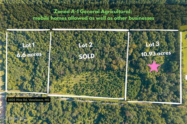 Remarkable opportunity in Vancleave, MS! Don't miss your chance to own almost 11 acres of beautiful land in the fast growing area of Vancleave. Total acreage available - 33.37 acres(available for purchase together or individually), offering flexibility for your vision. Once home to a pasture, the land is surrounded by a variety of mature trees including magnolias, live oaks, and pines - perfect for creating your dream property whether that's a private estate with a barn, workshop, horses, or other farm animals. Zoned A-1 General Agricultural: mobile homes allowed as well as other businesses. Fiber optic available. Serene setting just off MS-57 for an easy commute while still enjoying peace and privacy. This acreage offers endless potential - from farming to building your forever home. Call today for more details