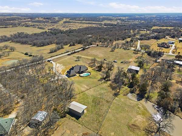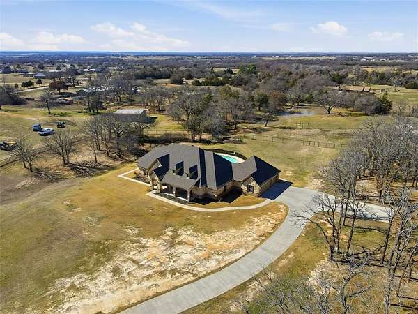Welcome to your private slice of Texas paradise in Decatur, where peaceful country living meets refined comfort. Situated on approximately 7.89 beautifully maintained acres behind a private electric gate, this stunning one-story ranch-style home offers the perfect blend of space, function and charm. Step inside to discover quality craftsmanship throughout including custom cabinetry, wood trim, crown molding and granite countertops. The open-concept layout creates a seamless flow between kitchen and living spaces- ideal for gatherings or quiet evenings at home. The attached three-car garage (two doors) offers ample space for vehicles, storage and hobbies. Outdoors, your personal retreat awaits with a custom in-ground pool, complete with a surrounding safety fence for added peace of mind. Equestrian enthusiasts and hobbyists alike will appreciate the impressive improvements. The 30x48 barn features three stalls, an enclosed tack room and water access-ready for horses or livestock. A 30x40 metal workshop provides excellent space for projects, with an additional 20'x40' overhang ideal for equipment, trailers, or recreational storage. Experience the best of Wise County living in this exceptional ranch property.