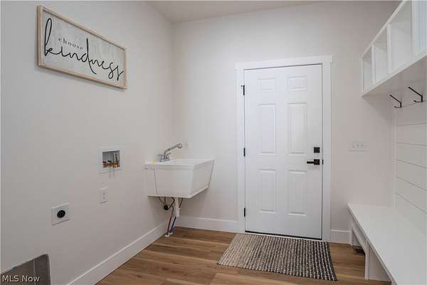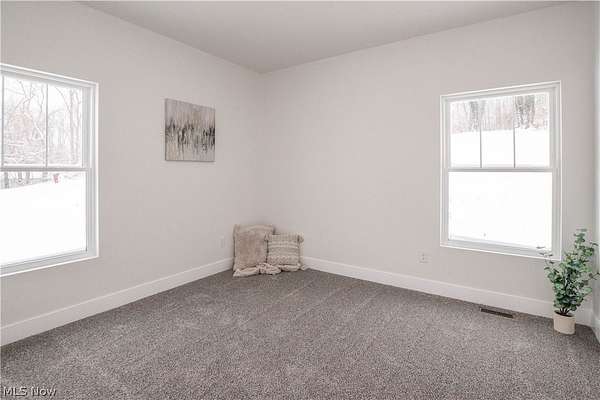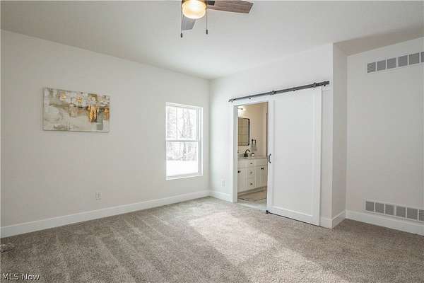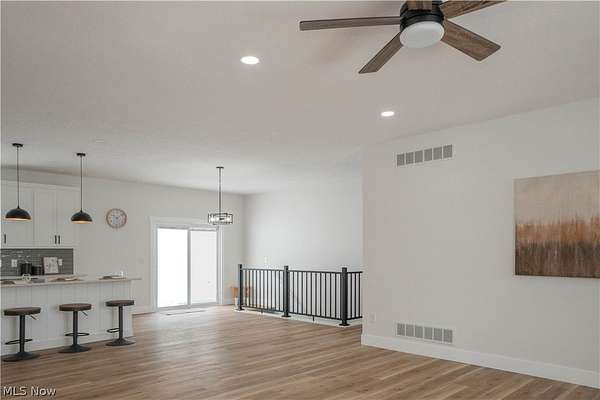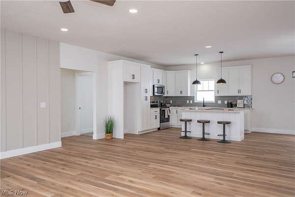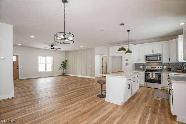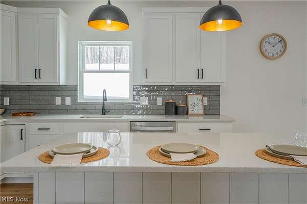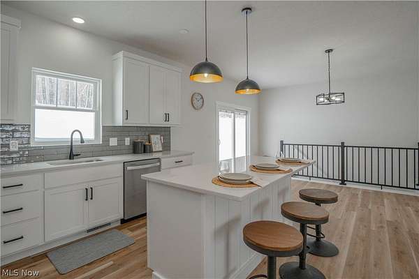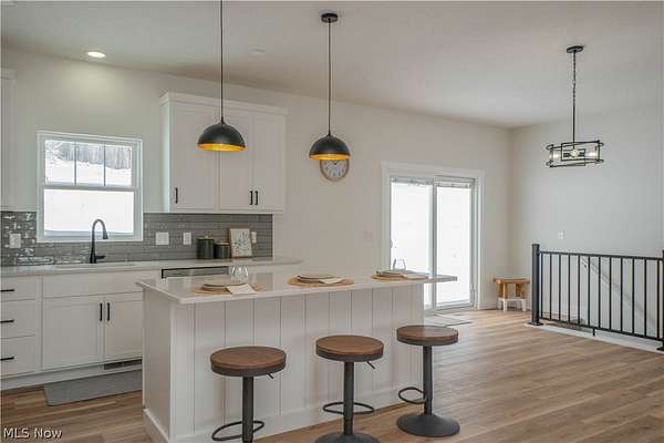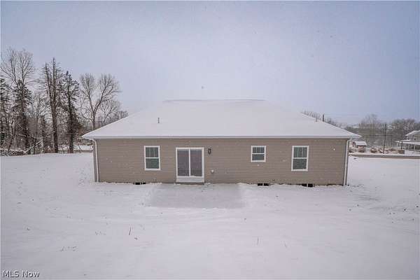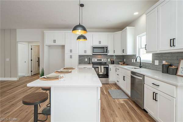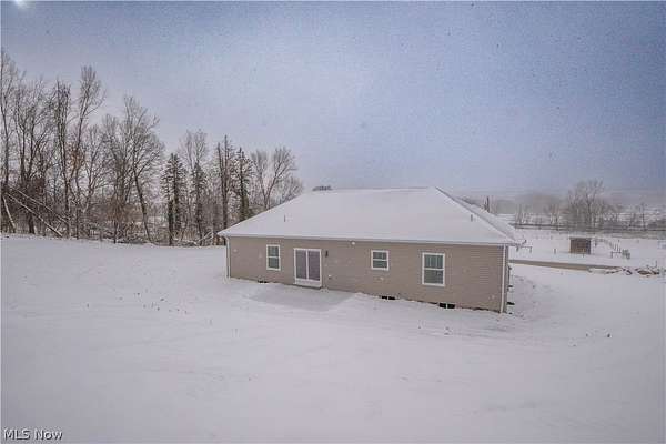 Brand-new 2025 ranch home set on a beautiful 2-acre wooded lot in Wadsworth Township! Be the first to call this thoughtfully designed 3-bedroom, 2-bath home your own. The welcoming exterior features a charming front porch with wood beam pillars and stone accents. Inside, enjoy an open-concept layout connecting the living room, kitchen, and dining area-perfect for everyday living and entertaining. The living room offers accent wall details, flowing seamlessly into the kitchen with a island with a breakfast bar, quartz countertops, tile backsplash, soft-close cabinetry, and sleek black finishes. The eat-in dining area includes sliding doors leading to the peaceful backyard. A convenient laundry/mudroom with built-in bench and storage adds everyday functionality. The primary suite features a barn door to a private bath with quartz countertops, a tiled shower and a large walk-in closet. Two additional main-level bedrooms share a full bath with tub/shower combo. The finished lower-level recreation room provides extra living space, with additional unfinished areas offering room for future expansion. Three-car garage, well and septic. A perfect blend of modern finishes, functionality, and serene outdoor space-don't miss this one!