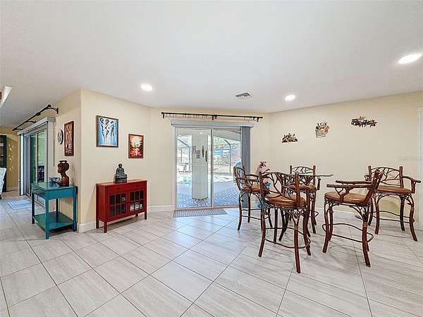 Through the gated entrance and handcrafted double doors you enter a bright open concept great room with tiled flooring throughout, coffered ceilings, recessed lighting and wide views of the screened lanai and pool area. Thoughtful features include ADA conscious design elements, solar panels and generous custom storage.