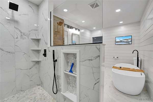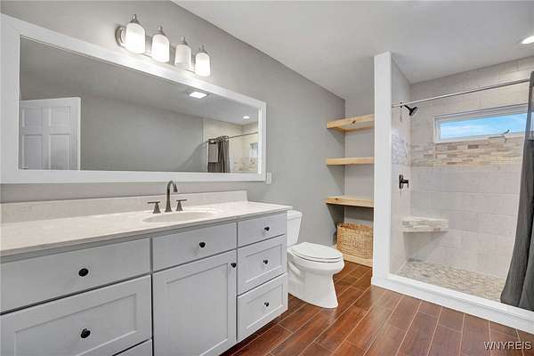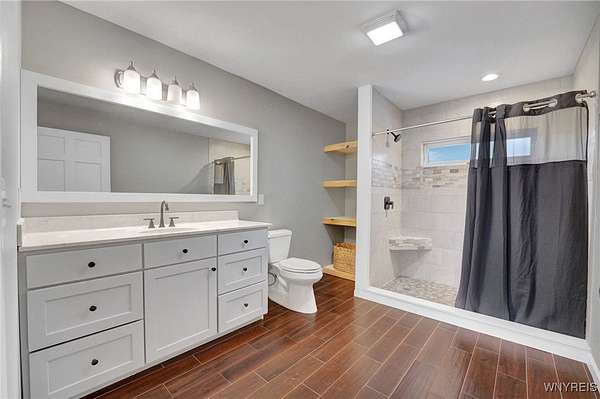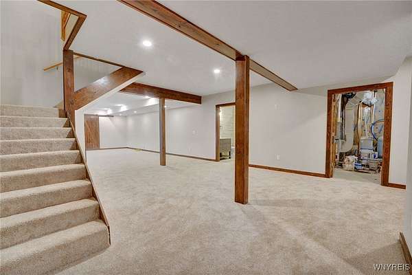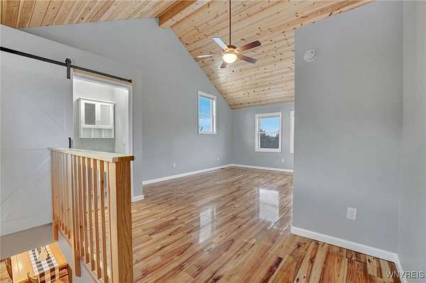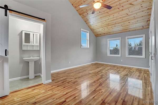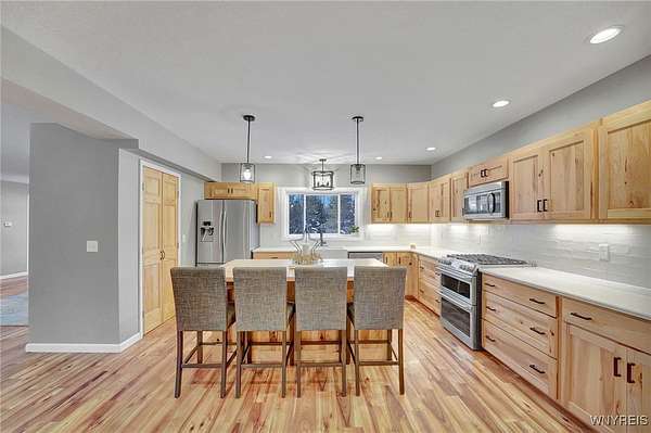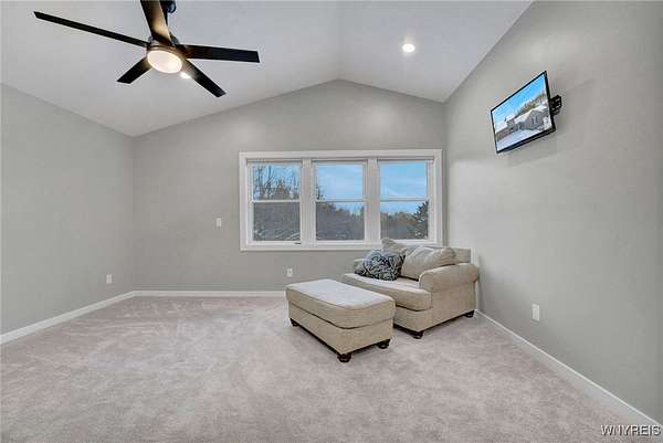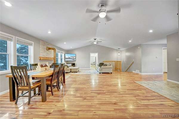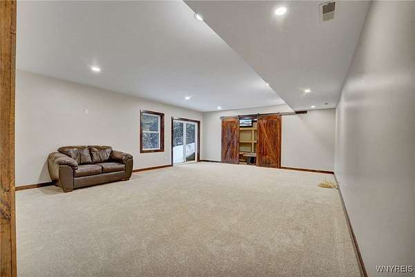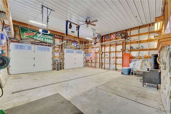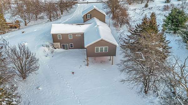 Discover this charming residence situated on almost 3 acs of serene landscape, featuring a large apple orchard, offering a peaceful retreat. This spacious property features a well-designed layout across 3 floors, perfect for both relaxation & entertaining. A paved driveway & stamped concrete patio welcome you at the entry, setting the tone for the quality found throughout the home. Upon entering the second floor, you're welcomed into an open-concept living area adorned with hickory hardwood flooring that seamlessly blends the living, dining, & kitchen spaces. The kitchen features Amish-built cabinetry and hickory hardwood island, quartz countertops, and a double oven, making it ideal for both everyday cooking & hosting. This level also includes the primary suite, complete with an en-suite full bath & a spacious walk-in closet. Two additional large bedrooms on this floor provide flexible living arrangements for family or guests. A bonus room adds versatility, suitable for an office, reading nook, or extra storage. Descending to the first floor, you'll find a large recreation room, offering flexibility for various activities, from family gatherings to game nights. This level includes a full bath for convenience, a large utility room with laundry, two dedicated storage rooms, and direct access to the outside for easy movement in & out of the home. The third floor, also enhanced with hickory hardwood flooring, is dedicated to a large private suite featuring a half bath and ample closet space-an ideal retreat for guests or a secluded personal getaway. This property also includes an Amish-built shed, and the addition offers heated floors & is equipped with underneath lighting for a future covered outdoor retreat, enhancing the functionality a& potential of the outdoor space. The surrounding natural beauty-including the orchard-enhances the overall tranquility, making this a delightful escape. This home offers a wonderful opportunity for comfortable living & is ready for your personal touch-all just minutes from everything the Village of Ellicottville and its renowned ski resorts have to offer. Sq. ft. does not match the county records, is based off agent measurements