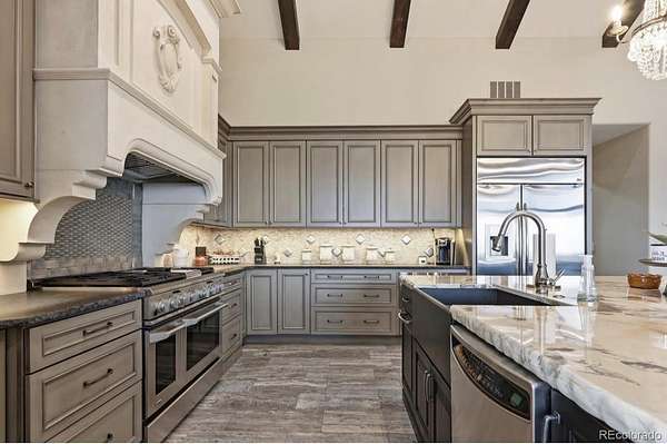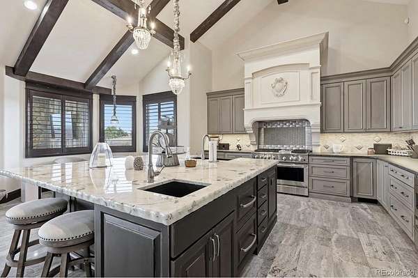 Where rustic elegance meets refined luxury, this home showcases intentional design and exceptional craftsmanship. Expansive windows and living spaces create openness while framing the surrounding landscape. Within the kitchen, a limestone hood, imported from Canada, anchors the space above stone countertops, while more than 5,000 pounds of granite are incorporated throughout the home’s surfaces. Heated floors add comfort, and two paneled drawer refrigerators are built into the oversized island.