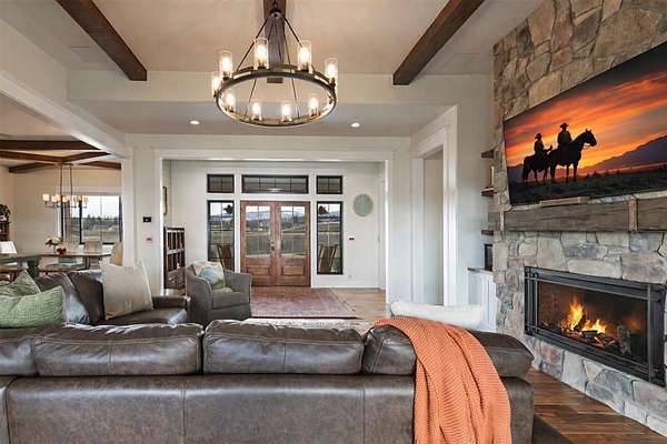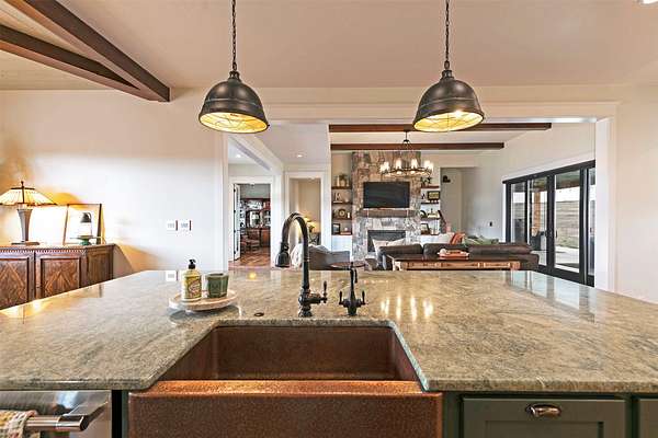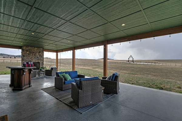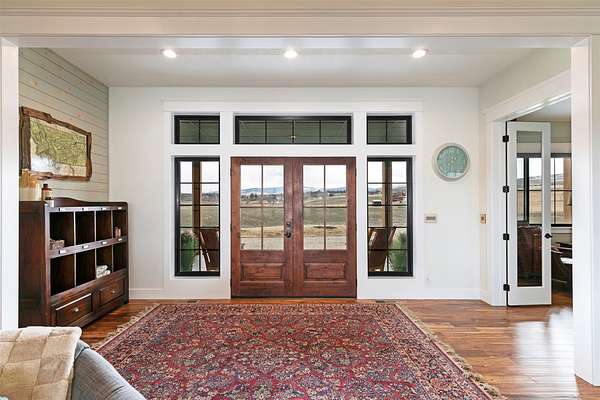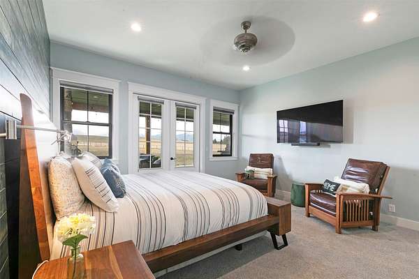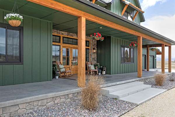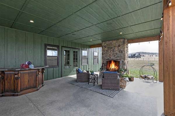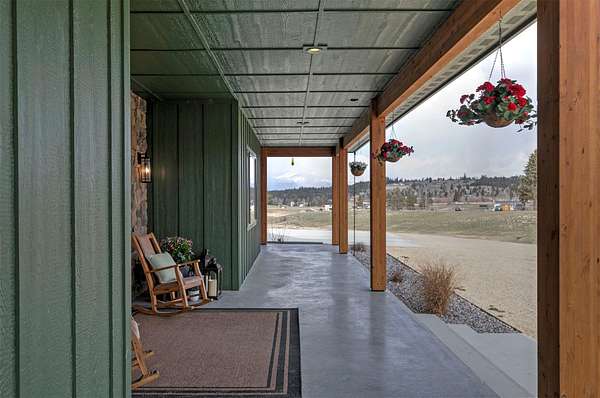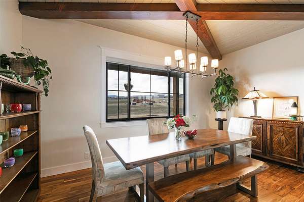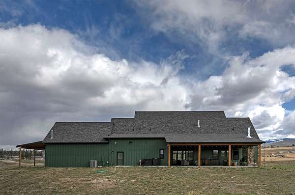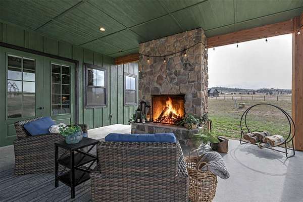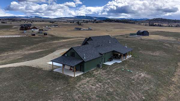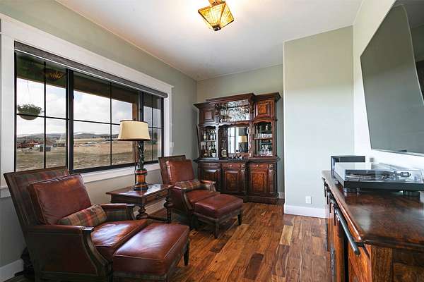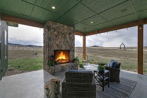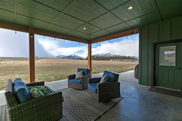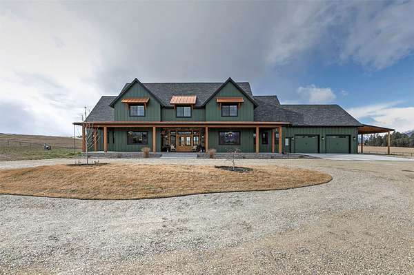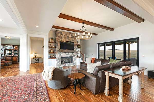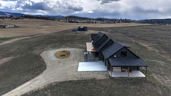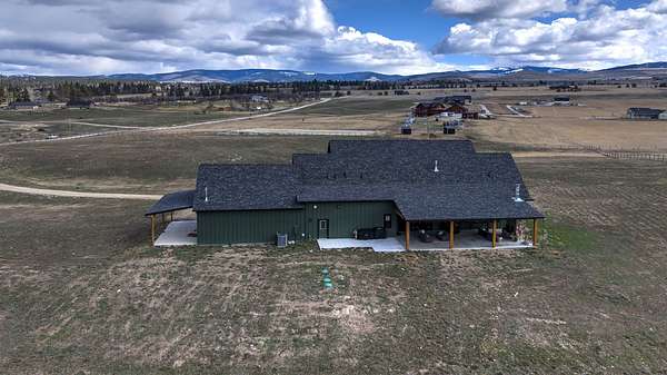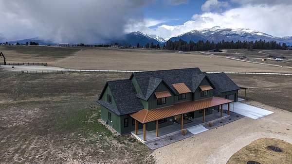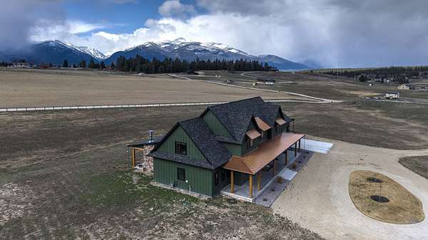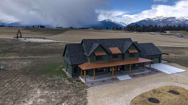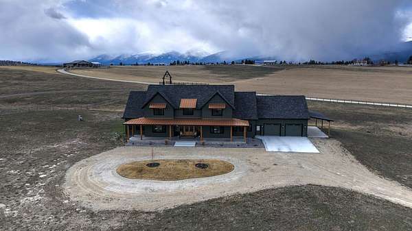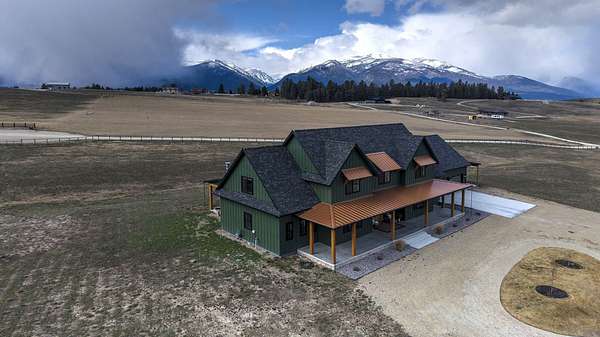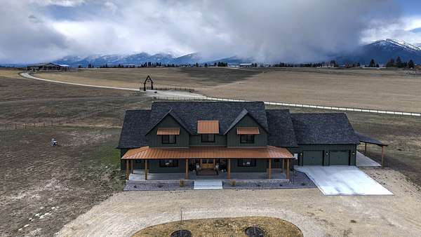 Experience the romance of authentic Montana living in this custom-crafted retreat, gracefully set on 10 private, fully fenced acres with breathtaking, unobstructed views of the Bitterroot Mountains. Thoughtfully designed long before construction began, every detail of this home reflects a rare blend of craftsmanship, comfort, and artistry. A wide covered porch welcomes you inside, where the living room unfolds beneath soaring 11.5-foot ceilings and a wall of expansive windows that frame the mountains like living artwork. At the center of the great room, a stunning fireplace features a mantle supported by custom copper brackets and is flanked by elegant open shelving. Warm acacia wood floors flow throughout the space, while a statement chandelier adds an inviting glow. The kitchen is both beautiful and functional-an inspired gathering space designed for everyday living and entertaining alike. A generous island anchors the room, surrounded by custom cabinetry, a handmade copper farmhouse sink and range hood, and a curated mix of granite and quartz countertops. Premium appliances and abundant workspace make meal preparation a pleasure, while the dining area, accented with exposed beams, creates the perfect setting for long meals and easy conversation. One of the home's most memorable features is the Whiskey Room-an intimate and welcoming retreat complete with a one-of-a-kind bar and unique memorabilia, offering the perfect place to unwind, share stories, and create lasting memories with friends and family. The main-level primary suite offers a peaceful sanctuary with 10-foot ceilings and serene mountain views. The spa-inspired bathroom features heated floors, a custom-tiled dual-head shower, soaking tub, dual vanities, and beautifully crafted cabinetry. A spacious walk-in closet with custom built-ins provides exceptional storage. A main-floor office, generous mudroom, and convenient powder room complete the thoughtfully designed main level. Upstairs, three spacious bedrooms-each with well-organized double closets-share a beautifully appointed full bathroom and a large bonus or TV room, perfect for family living or guests. Above the garage, a private-entry flex space offers endless possibilities, whether as guest quarters, a studio, home gym, or additional office. Outdoor living is just as exceptional. A massive wood-burning fireplace anchors the extended covered patio, creating a true outdoor living room ideal for year-round enjoyment. Gather around the fire beneath Montana's star-filled skies or enjoy outdoor dining while watching the ever-changing sunset across the mountains. The exterior is equally impressive, featuring cultured stone accents, copper-penny metal roof details, and a concrete patio already wired for a future hot tub. Modern conveniences include three Wi-Fi access points, a ceiling speaker system, remote-controlled window coverings, Andersen windows throughout, a water softener, and a whole-home humidifier. The heated oversized garage provides abundant storage and access to an unfinished upper area, while the lean-to offers additional covered parking. Set against the quiet beauty of ten pristine Montana acres, this extraordinary property offers privacy, craftsmanship, and sweeping views. More than a home, it is a place to gather, unwind, and fall in love with Montana every single day.