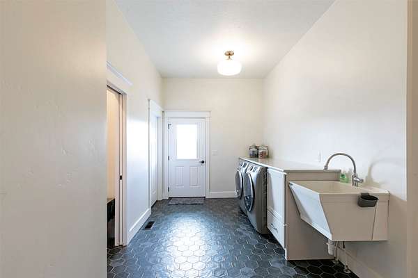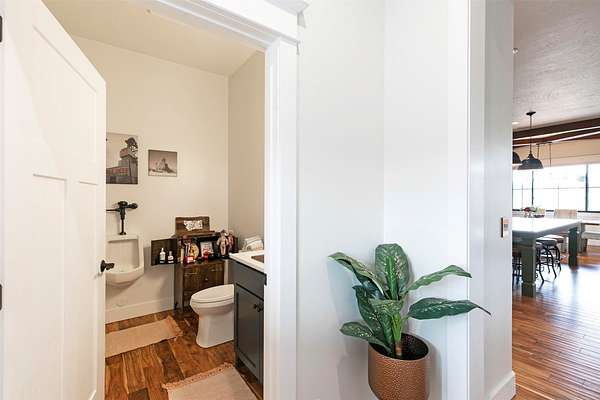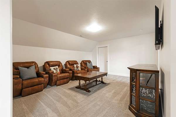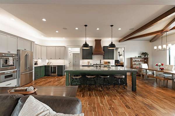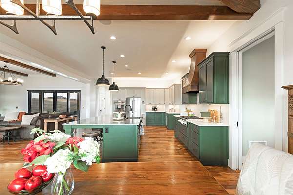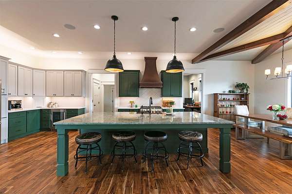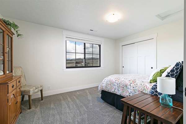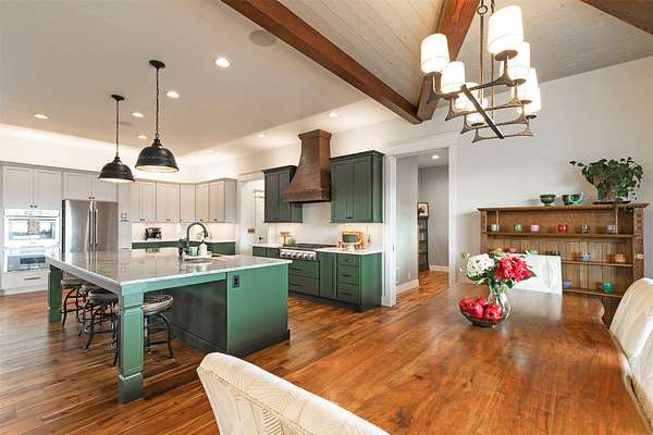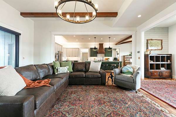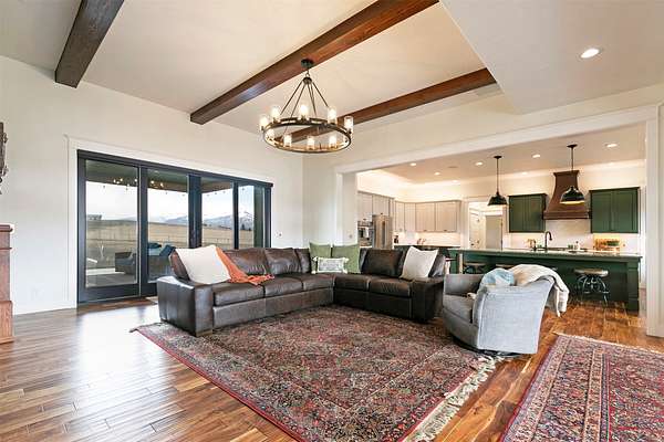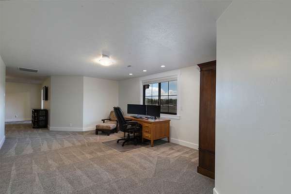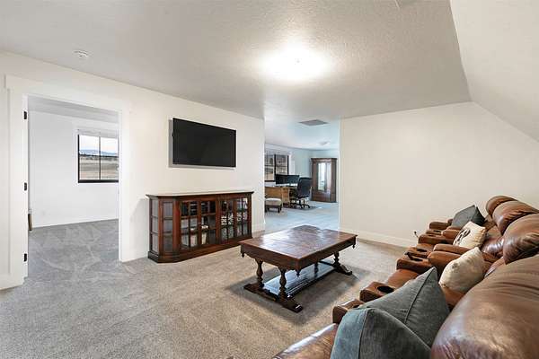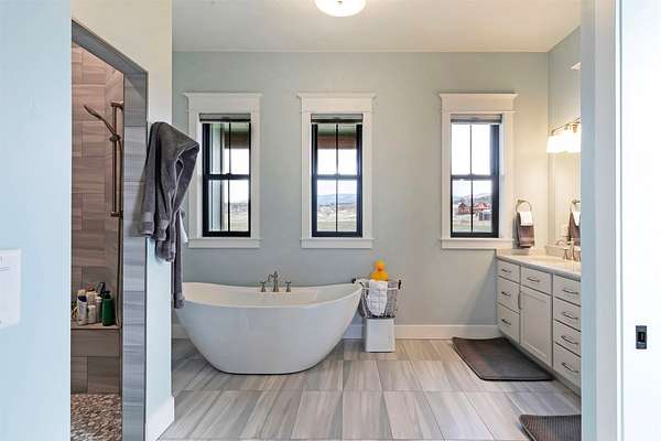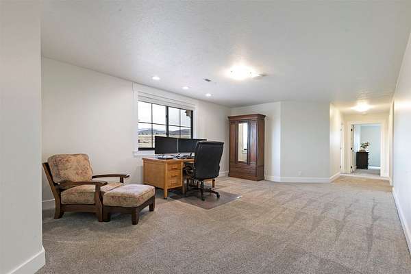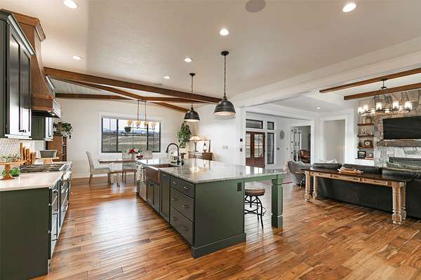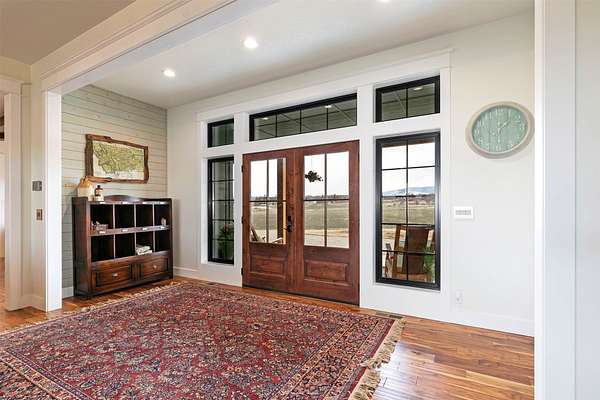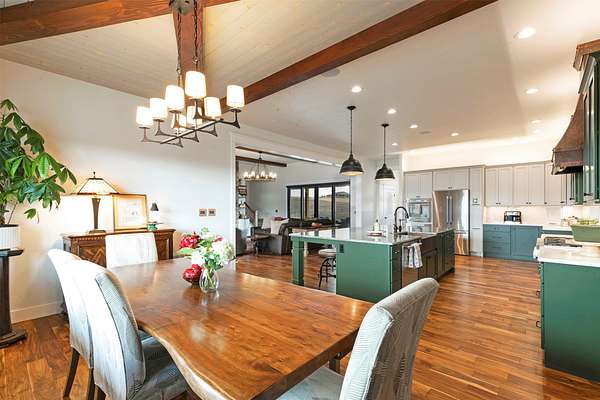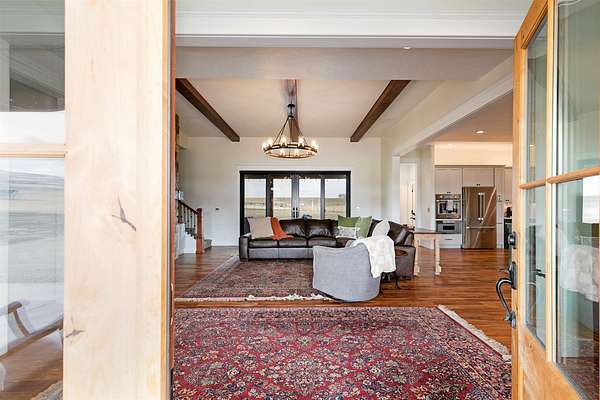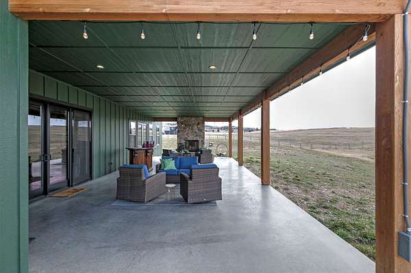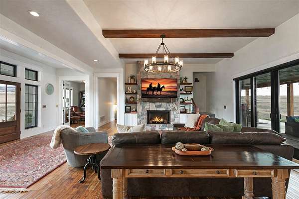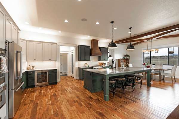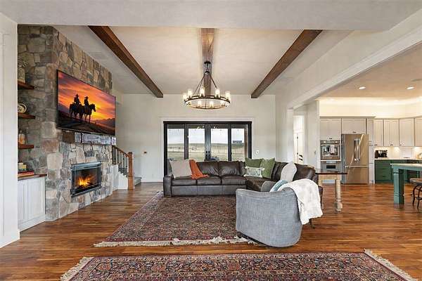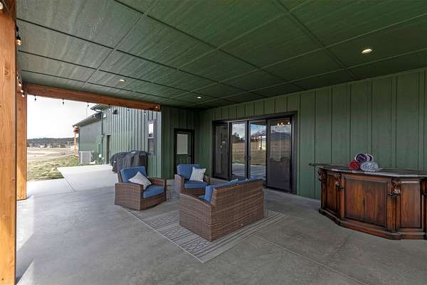 Experience the romance of authentic Montana living in this custom-crafted retreat, gracefully set on 10 private, fully fenced acres with breathtaking, unobstructed views of the Bitterroot Mountains. Thoughtfully designed long before construction began, every detail of this home reflects a rare blend of craftsmanship, comfort, and artistry. A wide covered porch welcomes you inside, where the living room unfolds beneath soaring 11.5-foot ceilings and a wall of expansive windows that frame the mountains like living artwork. At the center of the great room, a stunning fireplace features a mantle supported by custom copper brackets and is flanked by elegant open shelving. Warm acacia wood floors flow throughout the space, while a statement chandelier adds an inviting glow. The kitchen is both beautiful and functional-an inspired gathering space designed for everyday living and entertaining alike. A generous island anchors the room, surrounded by custom cabinetry, a handmade copper farmhouse sink and range hood, and a curated mix of granite and quartz countertops. Premium appliances and abundant workspace make meal preparation a pleasure, while the dining area, accented with exposed beams, creates the perfect setting for long meals and easy conversation. One of the home's most memorable features is the Whiskey Room-an intimate and welcoming retreat complete with a one-of-a-kind bar and unique memorabilia, offering the perfect place to unwind, share stories, and create lasting memories with friends and family. The main-level primary suite offers a peaceful sanctuary with 10-foot ceilings and serene mountain views. The spa-inspired bathroom features heated floors, a custom-tiled dual-head shower, soaking tub, dual vanities, and beautifully crafted cabinetry. A spacious walk-in closet with custom built-ins provides exceptional storage. A main-floor office, generous mudroom, and convenient powder room complete the thoughtfully designed main level. Upstairs, three spacious bedrooms-each with well-organized double closets-share a beautifully appointed full bathroom and a large bonus or TV room, perfect for family living or guests. Above the garage, a private-entry flex space offers endless possibilities, whether as guest quarters, a studio, home gym, or additional office. Outdoor living is just as exceptional. A massive wood-burning fireplace anchors the extended covered patio, creating a true outdoor living room ideal for year-round enjoyment. Gather around the fire beneath Montana's star-filled skies or enjoy outdoor dining while watching the ever-changing sunset across the mountains. The exterior is equally impressive, featuring cultured stone accents, copper-penny metal roof details, and a concrete patio already wired for a future hot tub. Modern conveniences include three Wi-Fi access points, a ceiling speaker system, remote-controlled window coverings, Andersen windows throughout, a water softener, and a whole-home humidifier. The heated oversized garage provides abundant storage and access to an unfinished upper area, while the lean-to offers additional covered parking. Set against the quiet beauty of ten pristine Montana acres, this extraordinary property offers privacy, craftsmanship, and sweeping views. More than a home, it is a place to gather, unwind, and fall in love with Montana every single day.
