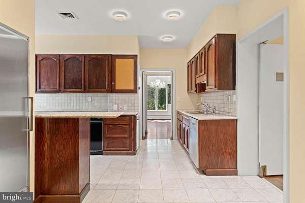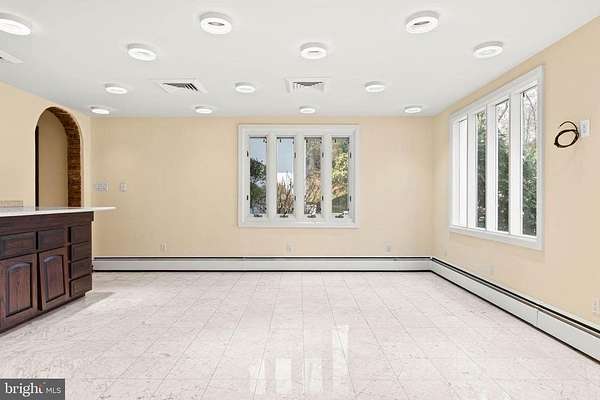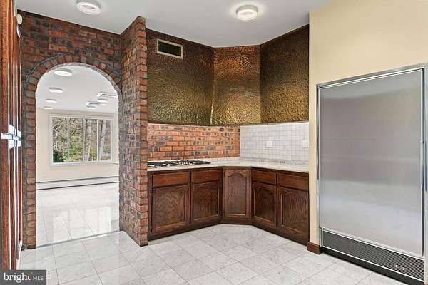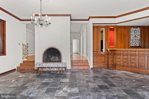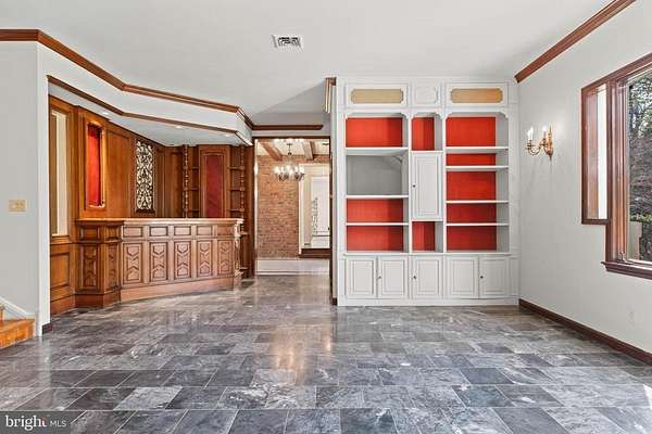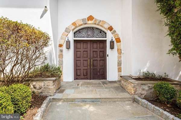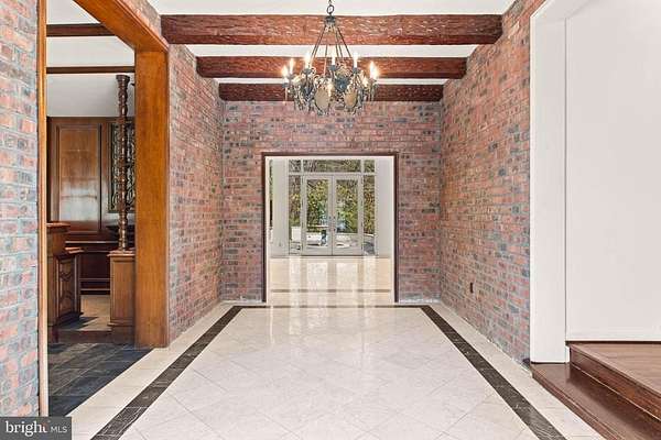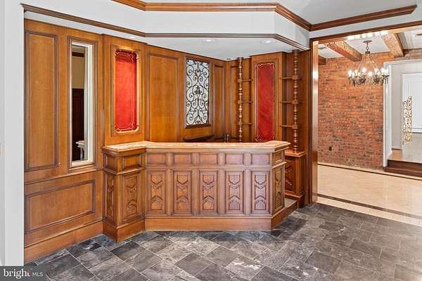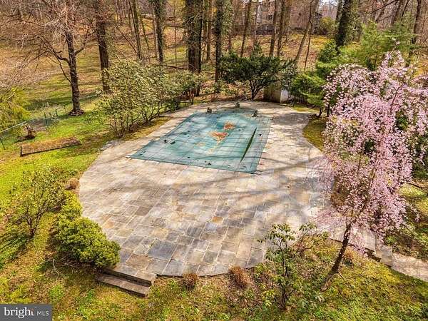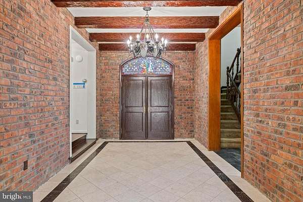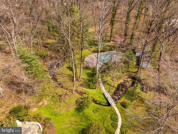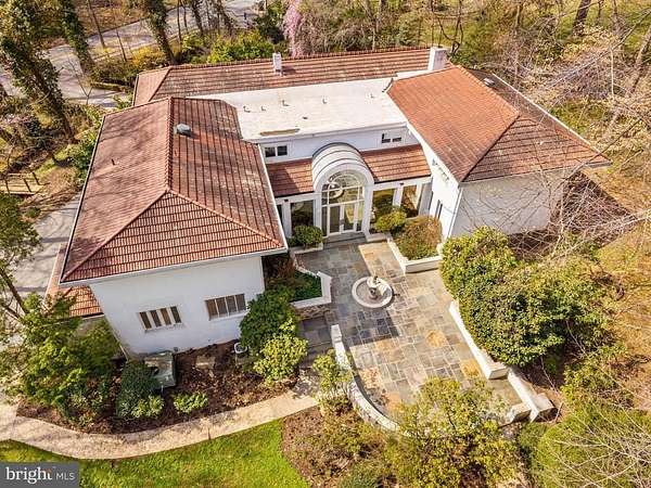 Few properties in Lower Merion combine this: 1.62 private acres, more than 8,000 square feet, and six bedrooms within minutes of Center City. This six-bedroom, 5.5-bath residence was designed for large-scale entertaining. The main level opens through a dramatic gallery entry - brick walls, exposed beam ceiling, marble floors - into a great room of nearly 36 by 21 feet, finished in polished marble with a crystal chandelier and French doors to the rear gardens and fountain patio. A step-down family room centers around a hand-carved walnut bar with iron scrollwork and marble top - a true architectural centerpiece. The 22x22' kitchen features granite countertops, dark wood cabinetry, and a hand-hammered copper hood set against a full-height brick wall. A breakfast room, catering room with bar and wine storage, private office with cherry built-ins, and two-stop residential elevator complete the main level. Six large bedrooms and four full baths upstairs, including a primary suite with marble bath and dressing room. Finished lower level. Auxiliary generator Swimming Pool. Fountain patio.