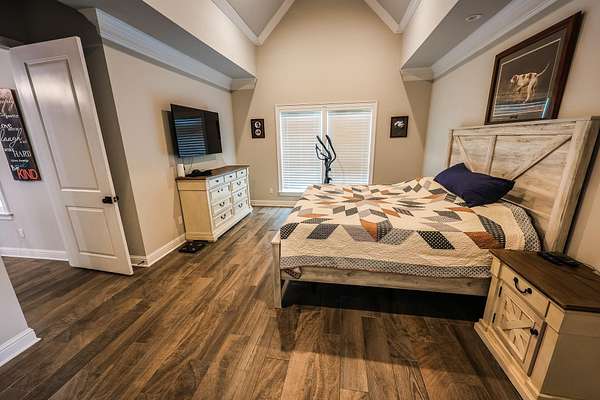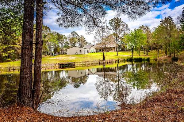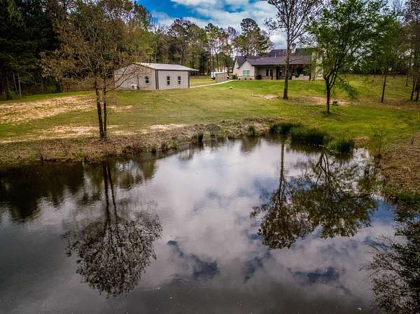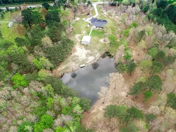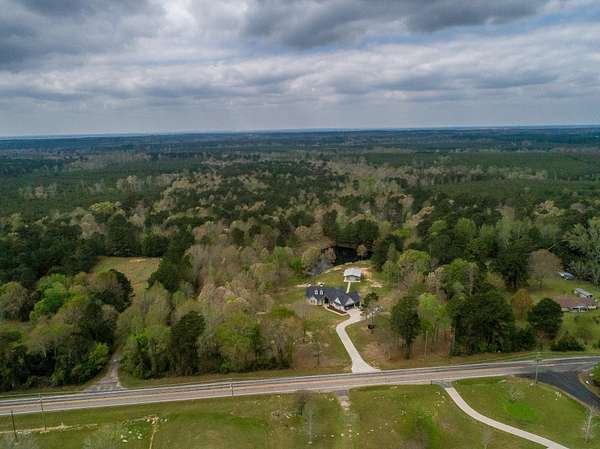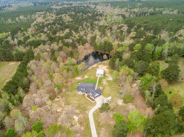 Custom-built two-story home nestled on 81 scenic, wooded acres featuring a creek and abundant wildlife. The spacious open-concept den and kitchen are perfect for entertaining. A 40x30 workshop includes living quarters complete with a kitchen and full bath—ideal for guests or extended stays. Enjoy outdoor living with a covered patio and fully equipped outdoor kitchen with fireplace, all overlooking a stocked pond with a fishing pier. Upstairs offers a versatile gameroom or additional bedroom, while the study can easily serve as a fourth bedroom. Property is equipped for outdoor enthusiasts with six deer stands and feeders included. A Kubota tractor and bush hog are also available, making this a true turnkey recreational retreat.