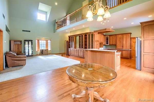 The spacious kitchen features abundant cabinetry and counter space, complemented by a central island for added functionality. Adjacent, the formal dining area is enhanced by a bay window offering scenic views of the private, expansive backyard. The main living room impresses with vaulted ceilings, creating an open and airy atmosphere throughout the primary living area.