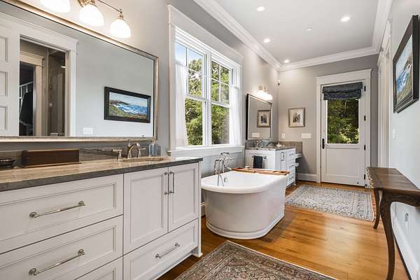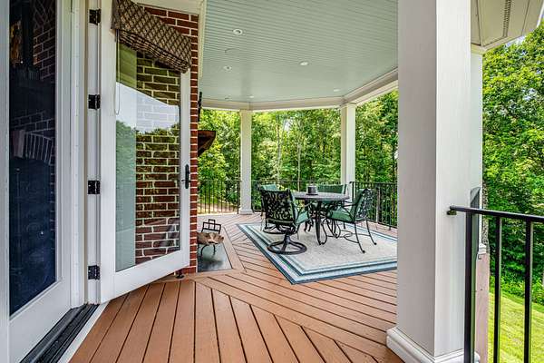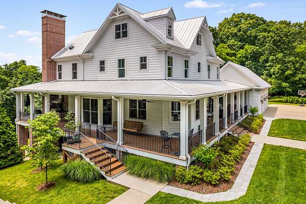 At the heart of the design is an expansive 1,800 sq ft wraparound porch — partially covered and perfectly suited for seamless indoor-outdoor living. The entire top floor opens into a dramatic entertainment space, while oversized Sierra Pacific windows and glass doors bathe every room in natural light and frame sweeping, private woodland views. Back-to-back masonry fireplaces anchor both the family room and the covered deck, lending warmth and character across seasons.