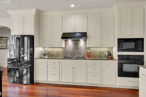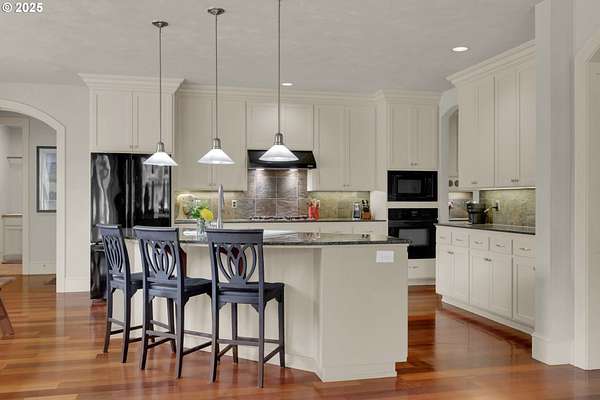 - Builtin Oven, Butlers Pantry, Cooktop, Dishwasher, Disposal, Free Standing Refrigerator, Gas Appliances, Granite, Island, Microwave, Plumbed For Ice Maker, Solid Surface Countertop