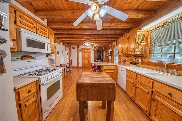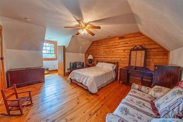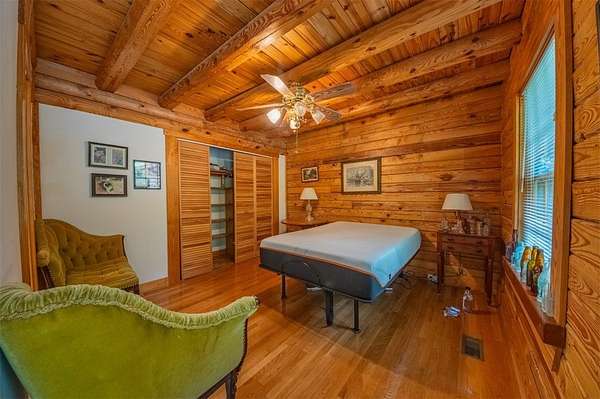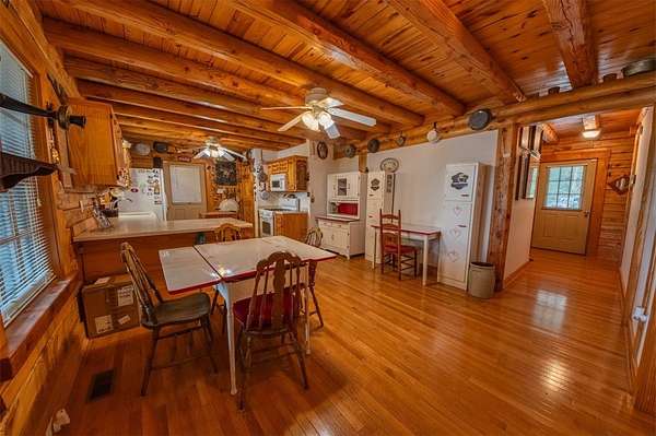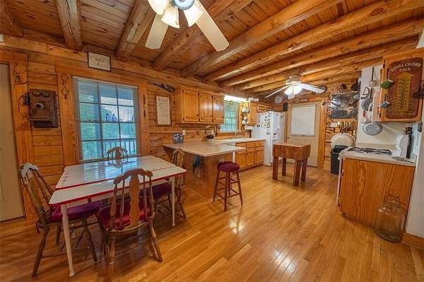 - Bath In Primary Bedroom, Beamed Ceilings, Bedroom On Main Level, Ceiling Fans, Dining Area, Eat In Kitchen, Fireplace, Pantry