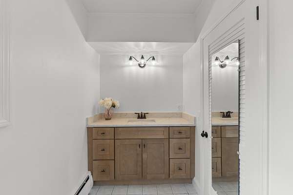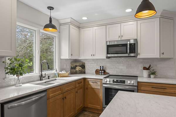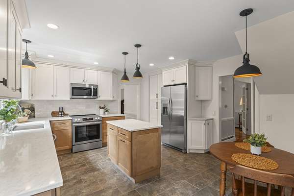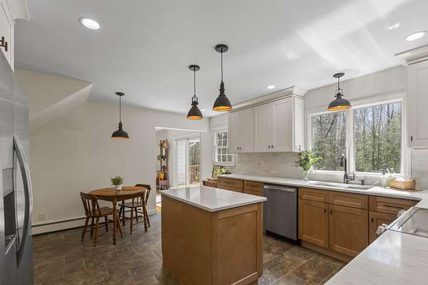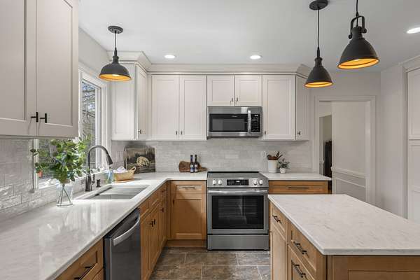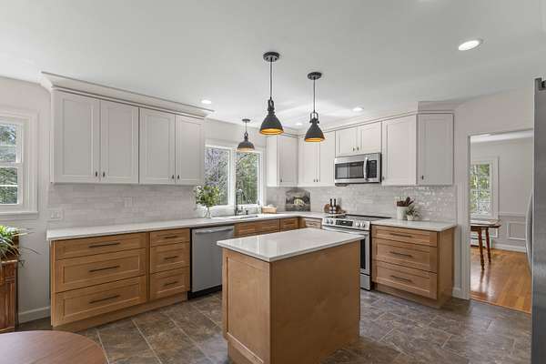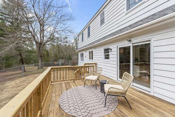 Thoughtful recent updates complement the home's original charm, featuring a beautifully renovated kitchen with quartz countertops, refreshed bathrooms, and tasteful interior improvements throughout. Step outside to a southern-facing fenced backyard with a deck and patio--ideal for relaxing or hosting guests--while wooded trails invite you to explore the surrounding landscape.