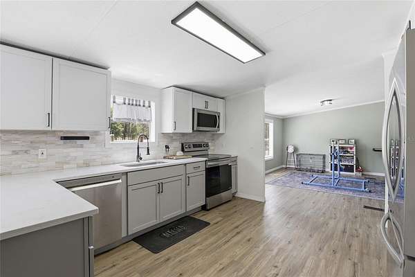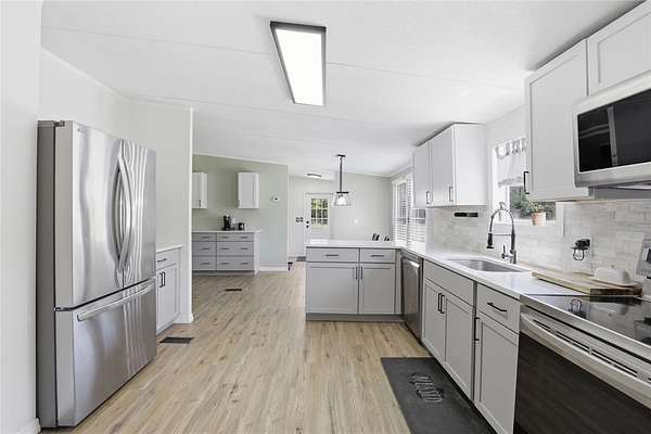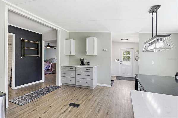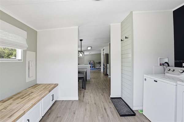 Inside, the open-concept layout features updated finishes throughout, including a stylish kitchen with quartz countertops, two-tone cabinetry, stainless steel appliances, and a walk-in pantry. The living area is anchored by a sleek electric fireplace, while a dedicated laundry/mudroom adds everyday convenience and storage.