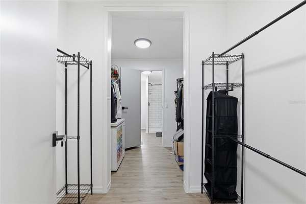 The primary suite offers a unique his-and-hers bathroom setup, one with a freestanding soaking tub and the other with a walk-in shower, along with spacious walk-in closets.