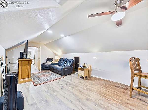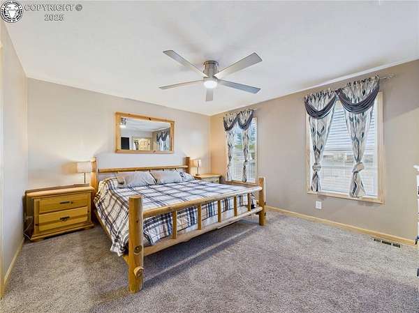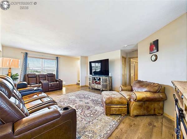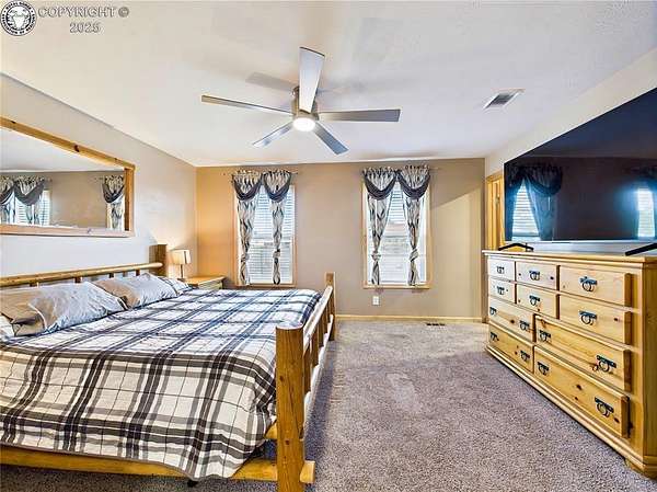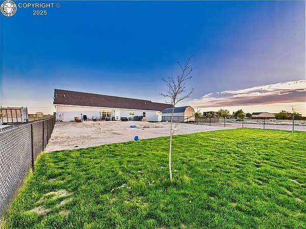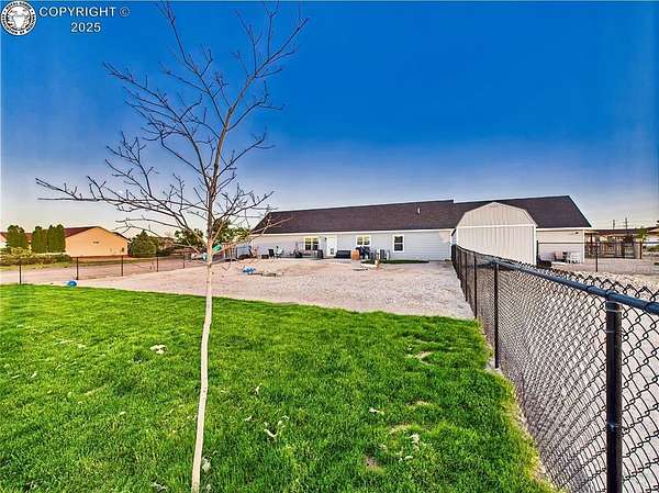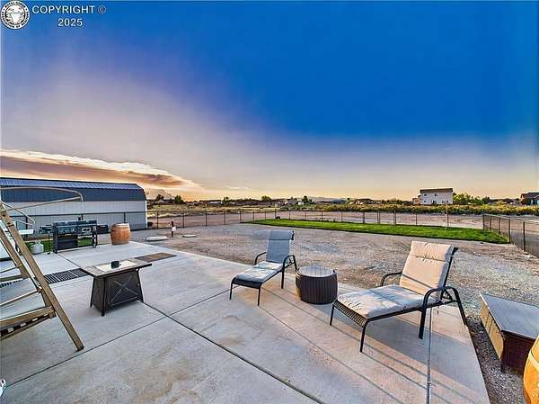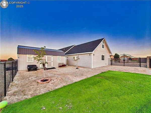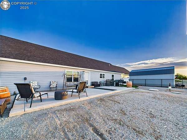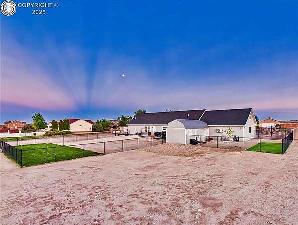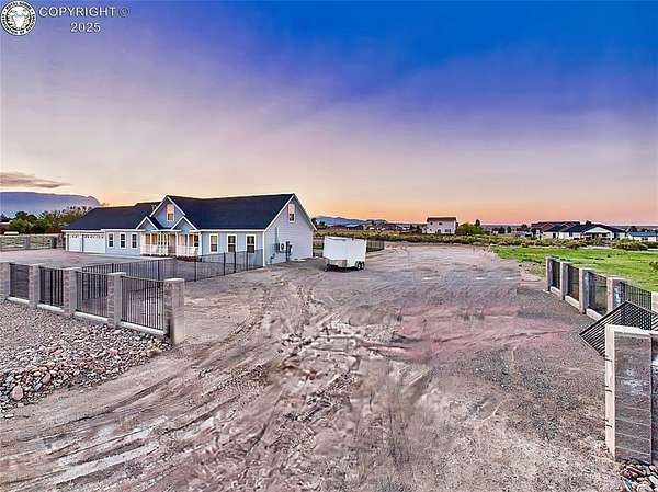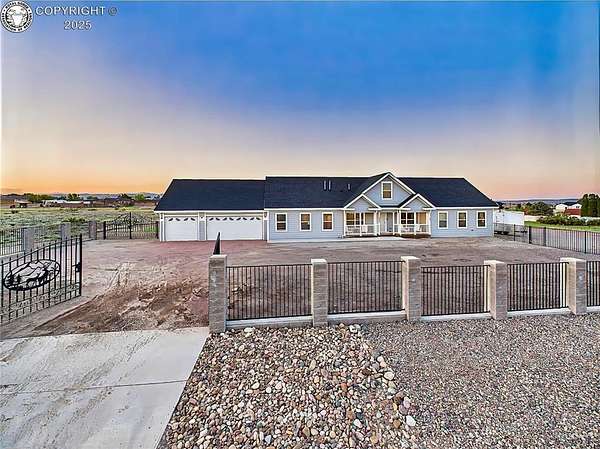 Spacious Main-Level Living with Bonus Second Story on 1.85 Acres in Pueblo West. Welcome to your Colorado retreat-offering 3,000 square feet of thoughtfully designed living space, mountain views, and room to roam. Inside, the gourmet kitchen is the centerpiece of the home, featuring a large island perfect for bar stools, 42-inch maple cabinets, solid surface counters, and stainless steel appliances-including a double oven, built-in microwave, range hood, and tile backsplash, walk-in pantry offers additional storage with extra cabinets, counters. Dining area connects the kitchen to the spacious great room, making it ideal for gatherings and everyday living. The main-level primary suite offers a relaxing retreat with a luxurious 5-piece bath that includes a soaking tub, double vanities, a spa-style walk-in shower with dual shower heads and bench, large walk-in closet. 2 additional bedrooms & full bath are located on the opposite side of the home. The mud/laundry room is conveniently located off the garage and includes a utility sink, built-in cabinetry, washer and dryer. Flexible space upstairs, you'll find a bonus level featuring spacious 4th bedroom with an en-suite 3/4 bath, a massive 38-foot-long family / rec room, and a separate office or flex space-perfect for a home gym, theater. Two mini-split systems ensure year-round comfort on the upper level. The front entry makes a bold first impression with decorative wildlife-themed gates framed by concrete pillars and metal panel accents lead you to the covered front porch. 3-car garage, large backyard with 12x24 storage shed with electricity., baseboard heat. Out back 39' x 17' concrete patio creates the perfect space for outdoor dining, entertaining, or relaxing while enjoying the mountain views, Back & Side yard has chain link fence. 2nd driveway to the side yard provides ideal space for RV or camper parking, with room to add future outbuildings. Minutes from Pueblo Reservoir, shopping, schools, & recreation.