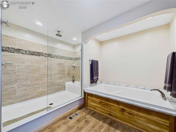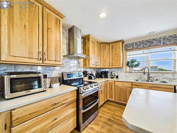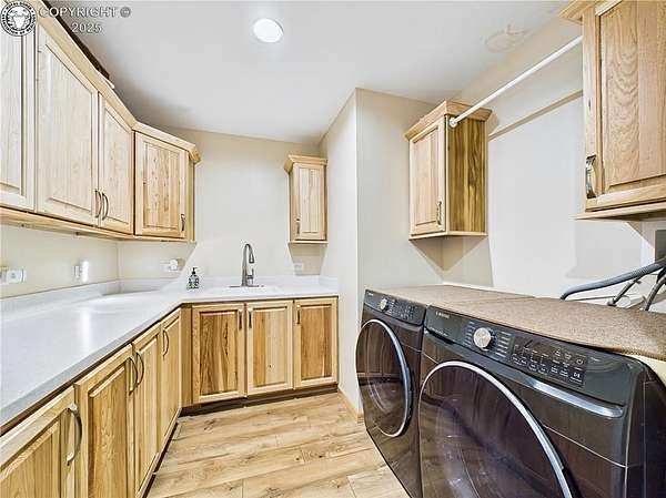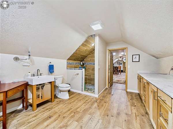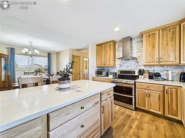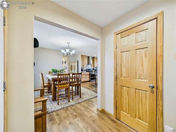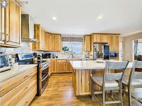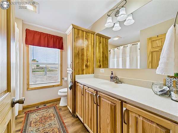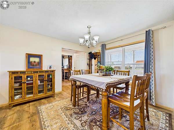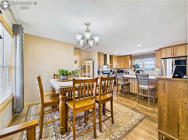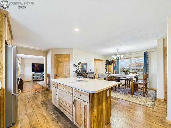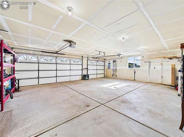 Spacious Main-Level Living with Bonus Second Story on 1.85 Acres in Pueblo West. Welcome to your Colorado retreat-offering 3,000 square feet of thoughtfully designed living space, mountain views, and room to roam. Inside, the gourmet kitchen is the centerpiece of the home, featuring a large island perfect for bar stools, 42-inch maple cabinets, solid surface counters, and stainless steel appliances-including a double oven, built-in microwave, range hood, and tile backsplash, walk-in pantry offers additional storage with extra cabinets, counters. Dining area connects the kitchen to the spacious great room, making it ideal for gatherings and everyday living. The main-level primary suite offers a relaxing retreat with a luxurious 5-piece bath that includes a soaking tub, double vanities, a spa-style walk-in shower with dual shower heads and bench, large walk-in closet. 2 additional bedrooms & full bath are located on the opposite side of the home. The mud/laundry room is conveniently located off the garage and includes a utility sink, built-in cabinetry, washer and dryer. Flexible space upstairs, you'll find a bonus level featuring spacious 4th bedroom with an en-suite 3/4 bath, a massive 38-foot-long family / rec room, and a separate office or flex space-perfect for a home gym, theater. Two mini-split systems ensure year-round comfort on the upper level. The front entry makes a bold first impression with decorative wildlife-themed gates framed by concrete pillars and metal panel accents lead you to the covered front porch. 3-car garage, large backyard with 12x24 storage shed with electricity., baseboard heat. Out back 39' x 17' concrete patio creates the perfect space for outdoor dining, entertaining, or relaxing while enjoying the mountain views, Back & Side yard has chain link fence. 2nd driveway to the side yard provides ideal space for RV or camper parking, with room to add future outbuildings. Minutes from Pueblo Reservoir, shopping, schools, & recreation.