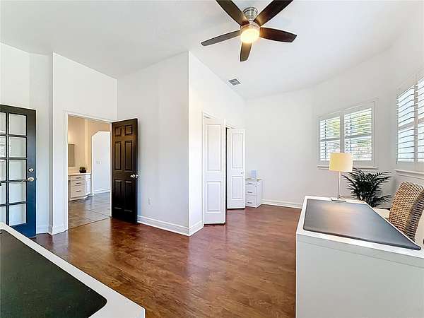 - Ceiling Fans(s), High Ceilings, Open Floorplan, Primary Bedroom Main Floor, Solid Wood Cabinets, Stone Counters, Thermostat, Vaulted Ceiling(s), Walk-In Closet(s), Wet Bar
