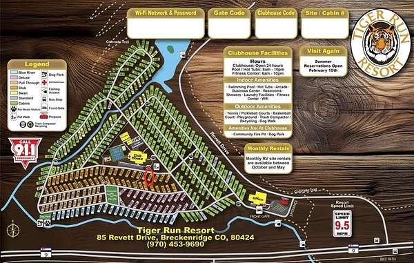 Take a look at this prime RV lot location within this gated and beautifully landscaped 53-acre paradise that is Tiger Run RV Resort, located just a few miles north of Breckenridge. The lot is situated across from the 12,000 square-foot clubhouse, providing easy access to the tennis & pickleball courts, indoor pool and hot tubs, exercise facility, laundry facility, owner's lounge, massive game room and business center. If you enjoy getting out into the mountain environment, you can take advantage of being located between the Blue and Swan Rivers, as well as being close to the national forest and the Colorado Trail, as well as the bike trail into Breckenridge or to Frisco, Copper Mountain, Vail and beyond.