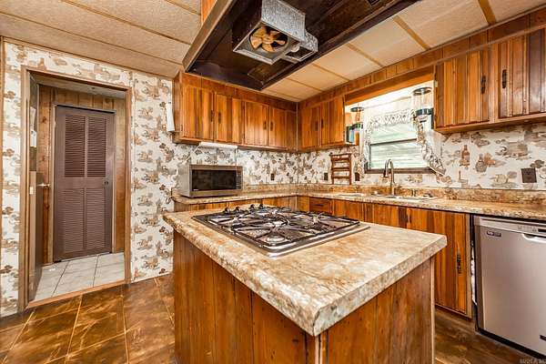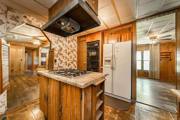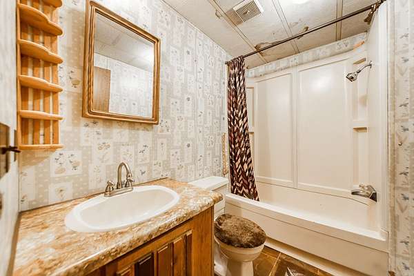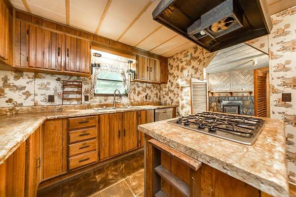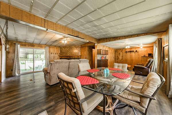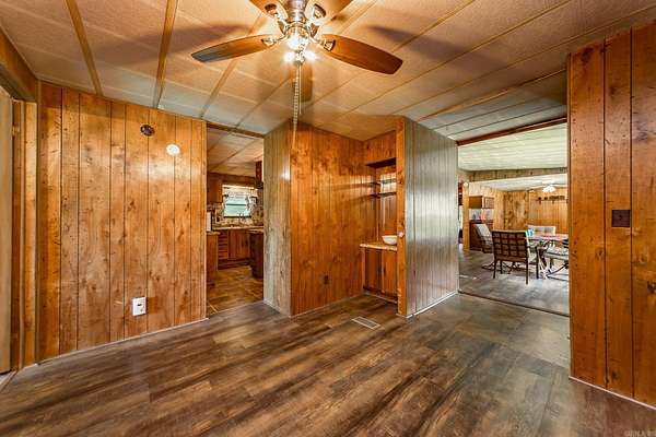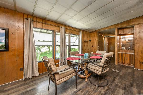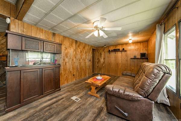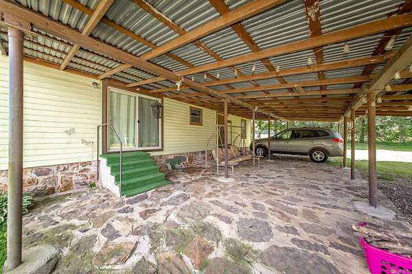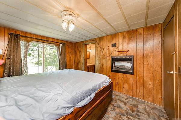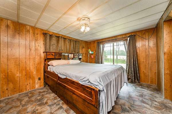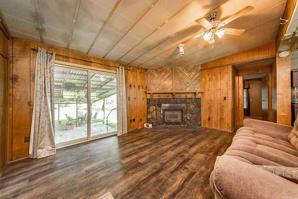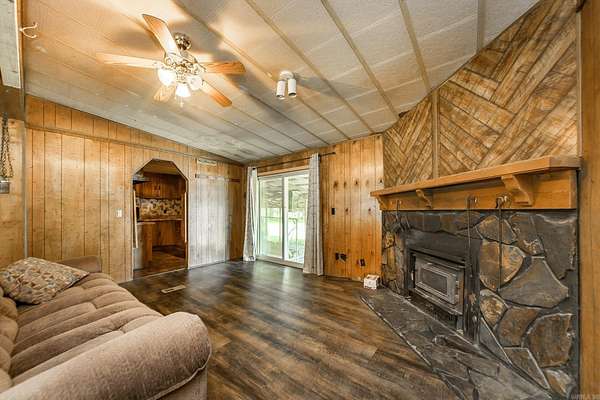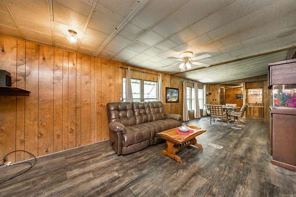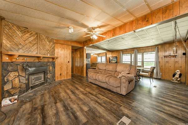 Escape to peaceful country living with this cozy 2-bedroom, 2-bath home situated on 5 beautiful acres, complete with a large pond and serene surroundings. This charming mobile home is perfect for those seeking space, privacy, and a relaxed lifestyle. The wood-burning fireplace with stone accents adds a warm, rustic touch to the inviting living area. Recent updates include new laminate flooring in the living/dining area and new sliding glass patio doors. A newer metal roof was installed in 2021, providing added peace of mind. The spacious primary suite features a built-in electric fireplace and a large bath with double vanities, a garden tub, and mirrored sliding closet doors. The entire property is fully fenced, with a separate fenced-in pen area ideal for pets. Additional features include a storage building and a storm cellar in the backyard. This property is a must-see for anyone craving a quiet country setting with room to roam!