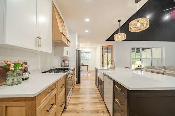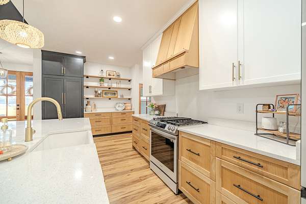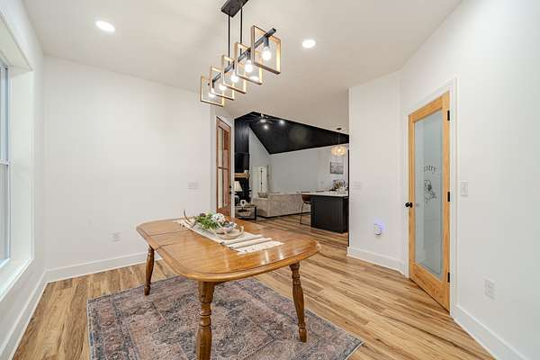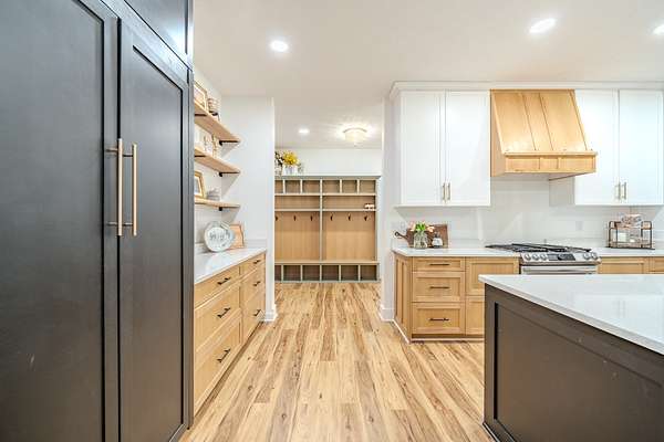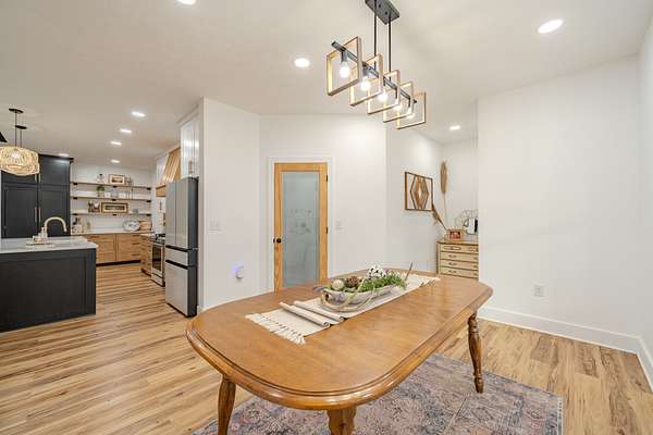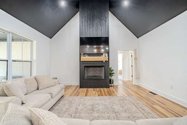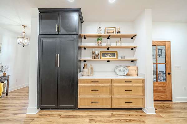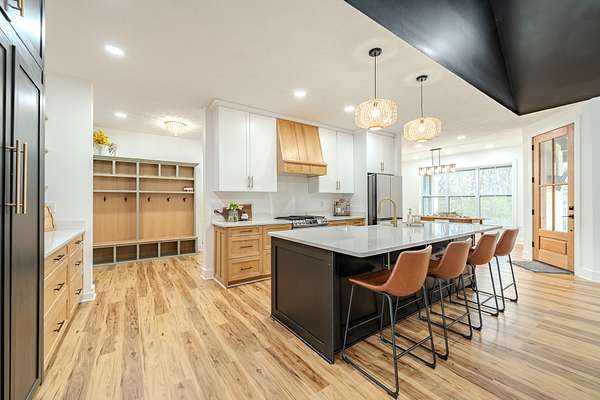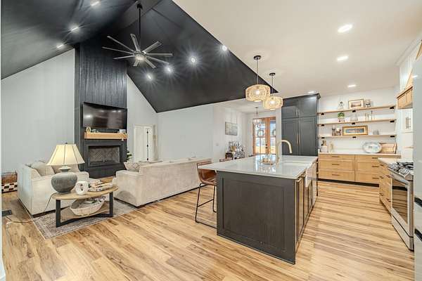 Welcome home to this beautifully designed modern farmhouse that perfectly blends warmth, style, and functionality. Situated at the end of a cul-de-sac in a desirable subdivision. From the moment you arrive, the striking exterior with contrasting brick and board-and-batten siding, dark accents, and inviting covered front porch sets the tone for what's inside.Step into a light-filled, open-concept living space featuring high ceilings, beautiful flooring and a dramatic floor-to-ceiling gas fireplace with a custom wood mantel.The chef's kitchen boasts a large island with seating, sleek soft close cabinetry with modern hardware, high-end appliances, quarts countertops, and elegant pendant lighting. The kitchen is complete with a well-appointed pantry designed for maximum storage and convenience.Whether hosting guests or enjoying a quiet night in, this space is both stylish and highly functional.