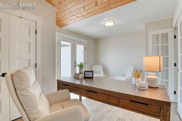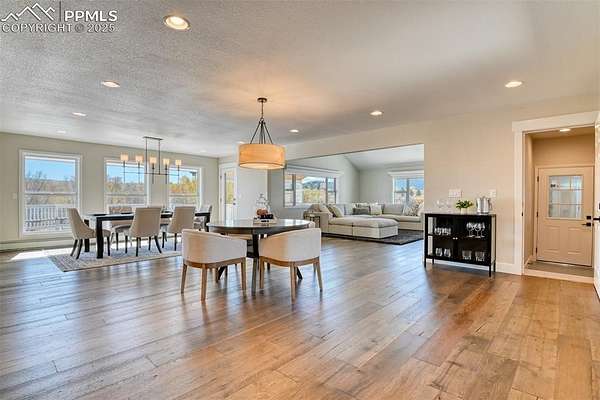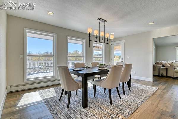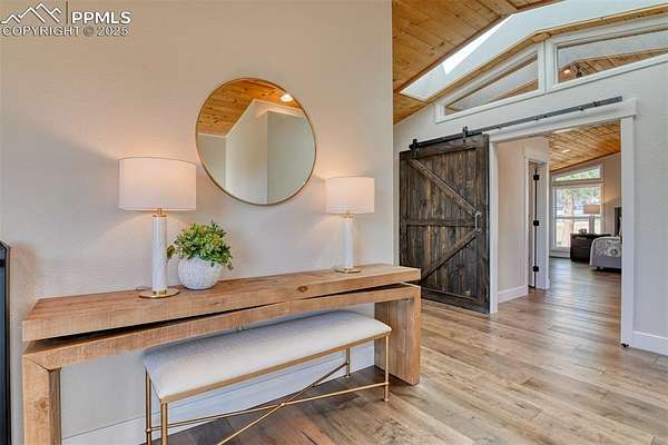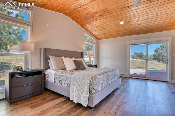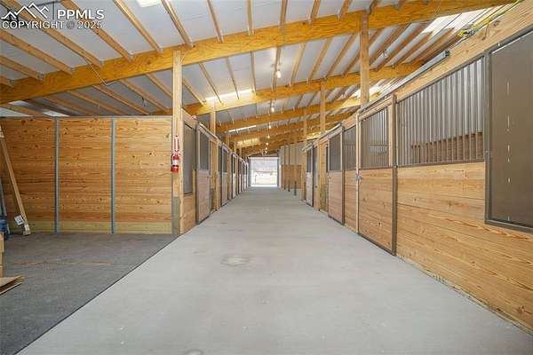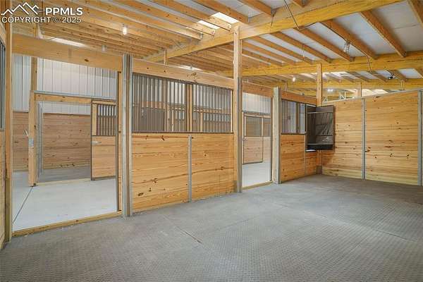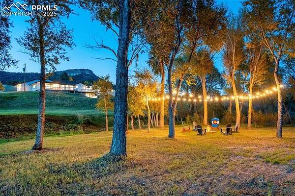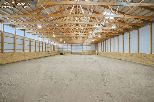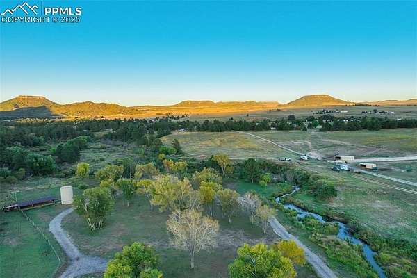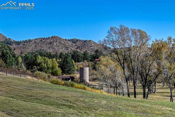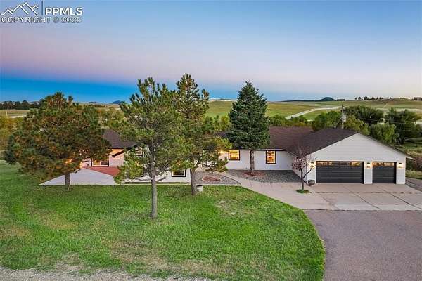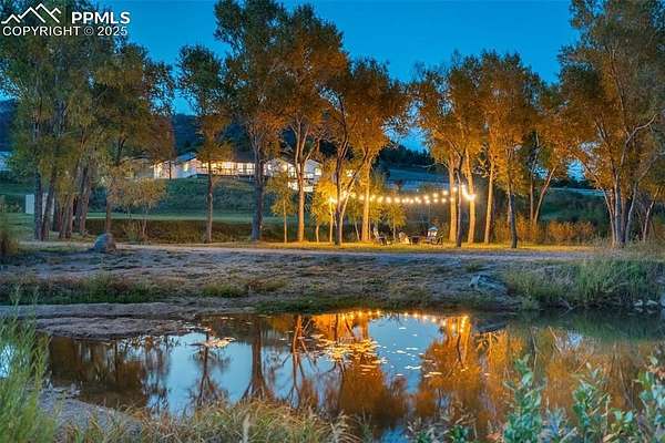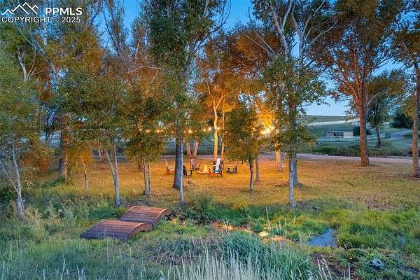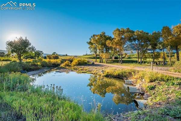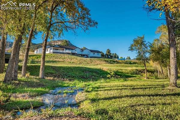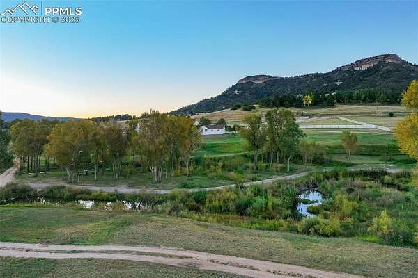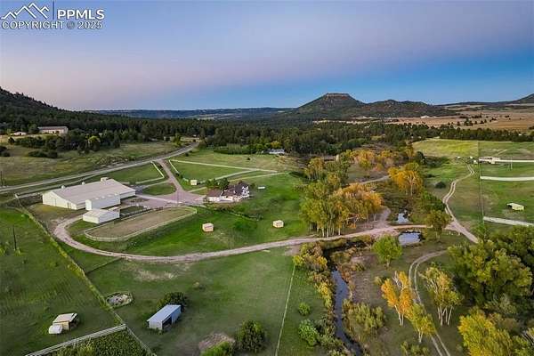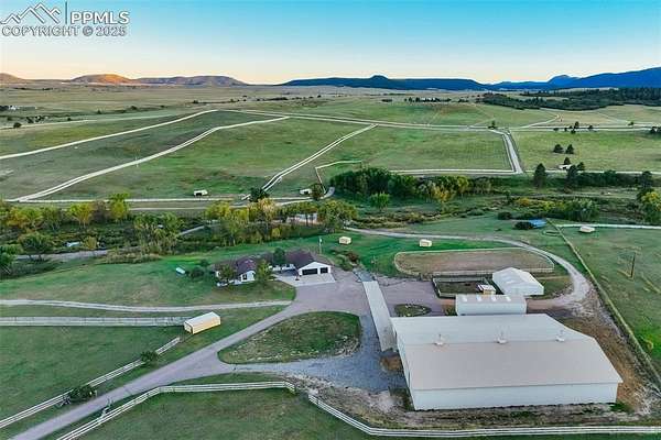 Rare opportunity to own this beautiful 50-acre pristine property near Larkspur. This extraordinary estate is a rare blend of natural beauty and ample space for whatever you can imagine. Plum Creek gracefully meanders through the center of the property, creating a picturesque waterway stocked with fish and a multitude of wildlife, all surrounded by mature willow trees, creating a serene, storybook setting. Positioned near I-25 and with ample water rights, it's ideal for additional buildings and a variety of uses. Ideally suited for equestrian luxury, this property seamlessly combines thoughtful design with expansive pastures and tree-lined meadows, offering an unmatched lifestyle of comfort, space, and breathtaking views. The impressive, newly built 12,000 square foot building features an indoor riding arena, eight horse stalls, a washing area, a tack room, an office, and a bathroom. Additional buildings consist of a spacious hay barn, workshop, chicken coop, historic silo with a milking shed from the original homestead, and multiple loafing sheds throughout. The 50 acres are extensively fenced with premium 5" white vinyl and a large outdoor riding arena. The fully remodeled main home features an open, light-filled floor plan designed to frame breathtaking views of the surrounding buttes, rolling meadows, and distant mountains. Large windows capture the natural beauty of the valley, ponds, and creek, creating a seamless connection between indoor comfort and the outdoors. This sprawling rancher showcases an open-concept design that harmonizes contemporary finishes with the enduring warmth of classic ranch style. A prime additional building site is perfectly positioned to take in panoramic mountain views and Plum Creek as it runs through the center of the property. Whether you're envisioning a luxury equestrian estate or a serene private retreat, this legacy property also has direct access to miles of trails and open space leading to Spruce Mountain.
