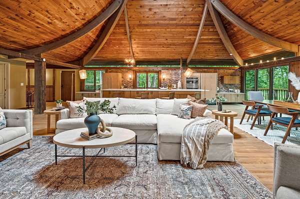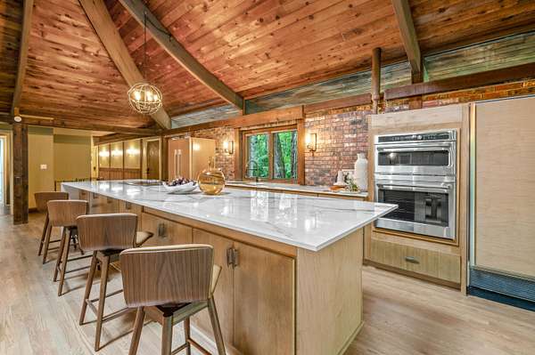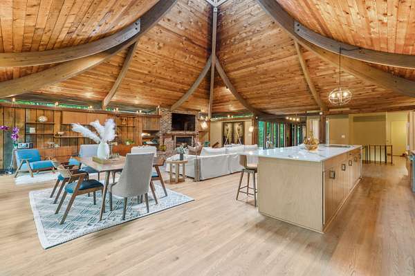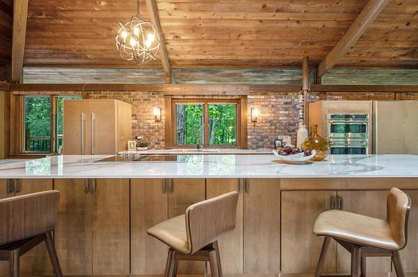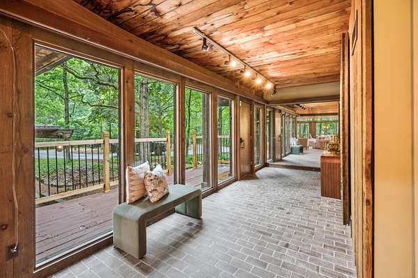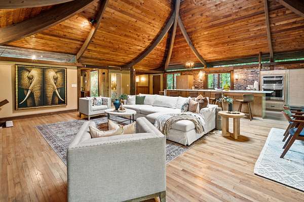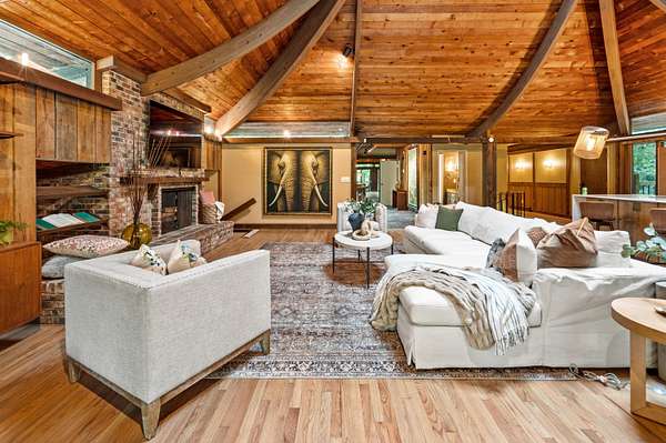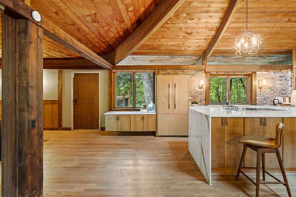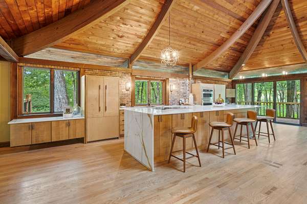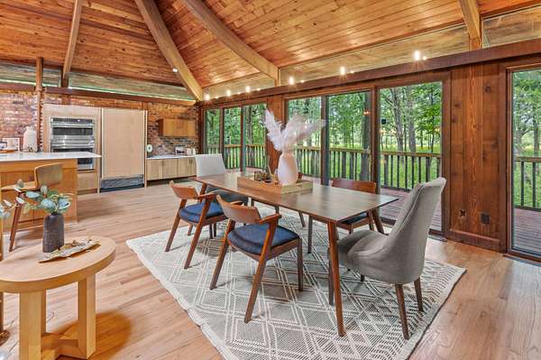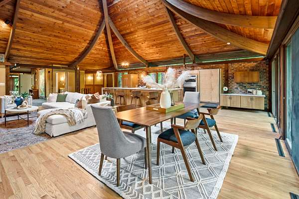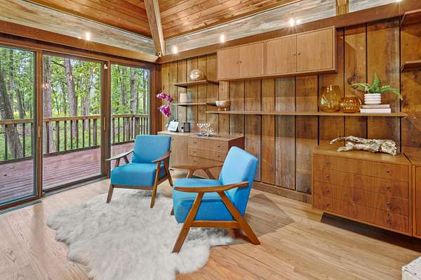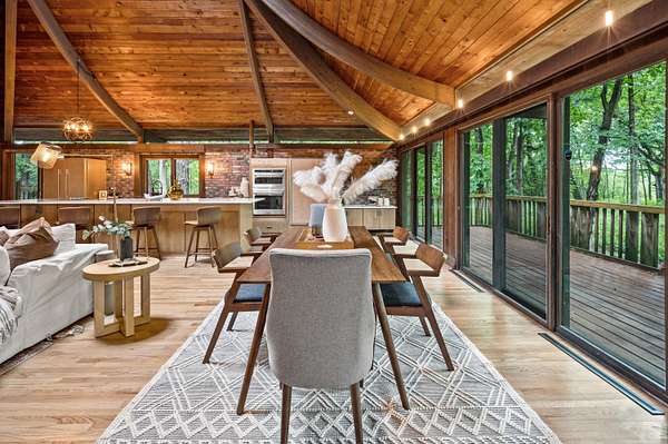 Step into a rare fusion of artistry and architecture in this striking mid-century modern house, masterfully designed by prominent Milwaukee Architect James G. Plunkett as his personal residence. Set on a generous lot nestled seamlessly into the landscape, this home embodies organic architecture with clean lines, natural materials, and a timeless aesthetic. Walls of glass blur the boundaries between indoors and out, flooding the open-concept living spaces with natural light and framing serene views of the surrounding landscape. The heart of the home is open and spacious creating a warm, inviting ambiance. The kitchen, tastefully updated in harmony with the architectural heritage. This one-of-a-kind property is more than a home--it's a living piece of design history.
