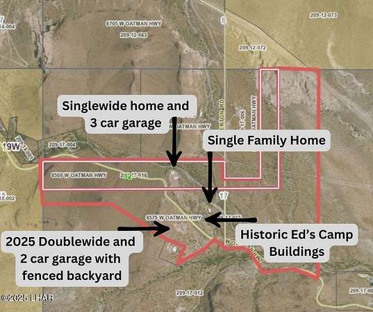 First Time Ever on the Market! Historic Ed's Camp on Rt 66 - 121 Acres of Unique Opportunity! Own a true piece of Americana along Historic Route 66. This rare 121-acre property (two parcels) includes 3 homes totaling 2,781 sf, 5 electric meters, 2 private wells, 2 septic systems, and tons of potential. The 85-acre parcel includes a 3 bed/2 bath 1,040 sf double-wide (central AC/heat, chainlink fenced yard, 2-car carport, 30x25 garage), and a 2 bed/1 bath 1,013 sf 1964 home with updated kitchen/bath (in last decade) and large attic. It's also home to the nostalgic Ed's Camp - a Route 66 gem ready for restoration into a museum or business. The second 36-acre parcel features a remodeled 2 bed/1 bath home with open layout, butcher block counters, 2 mini-splits, large covered patio, 1,300 sf 3-bay garage, and a 20x20 outbuilding (half meat processing, half workshop). There's also a 5th electric meter with a 50-amp RV hookup and water. Incredible views, history, and potential for retreat, income, or redevelopment!
