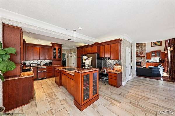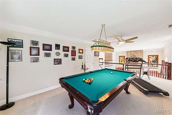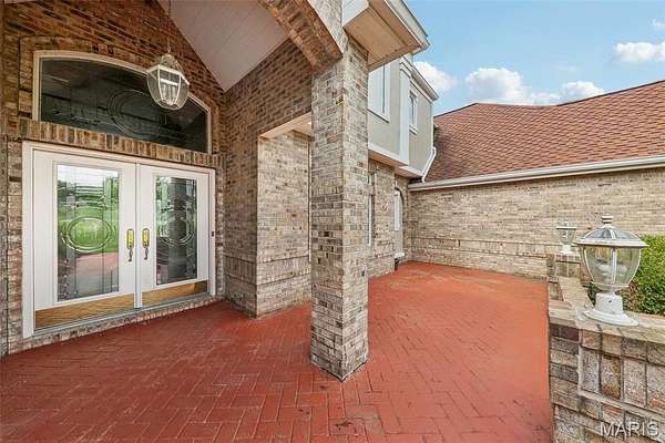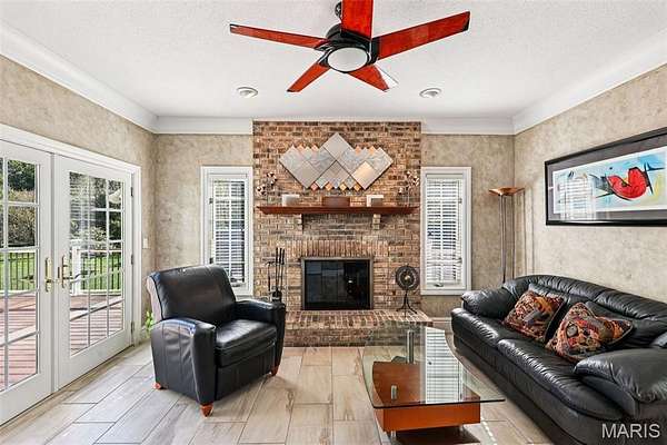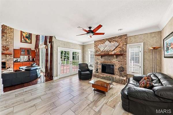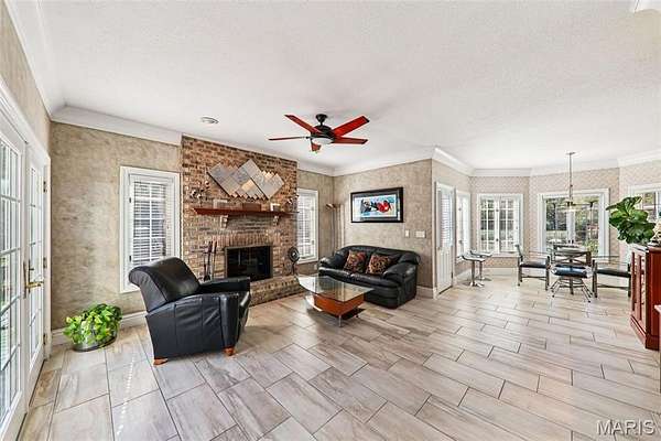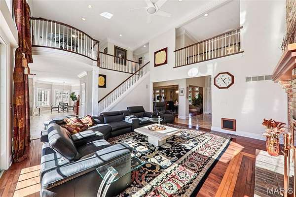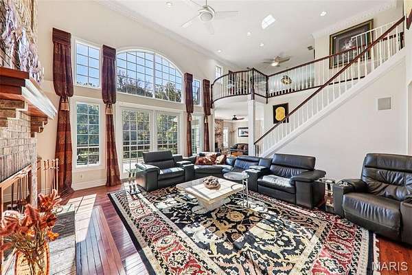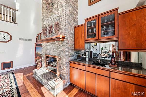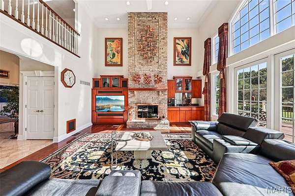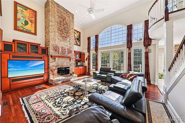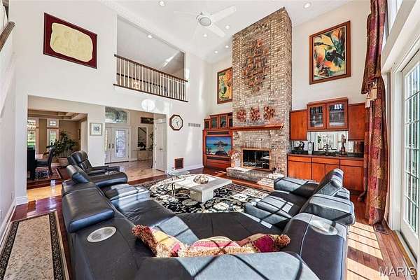 The great room serves as the architectural centerpiece, anchored by an imposing brick fireplace and framed by dramatic vertical space that connects the main level to the upper balcony overlook. Built-in entertainment features, surround sound, and a full wet bar transform the space into an ideal setting for refined entertaining or intimate gatherings.