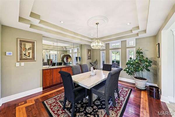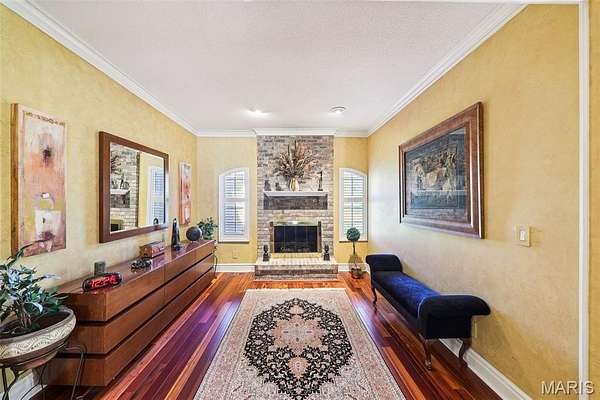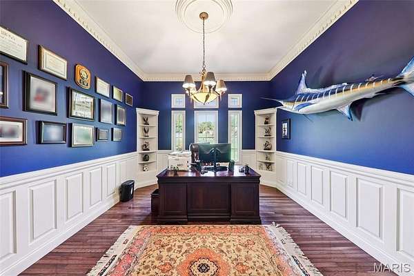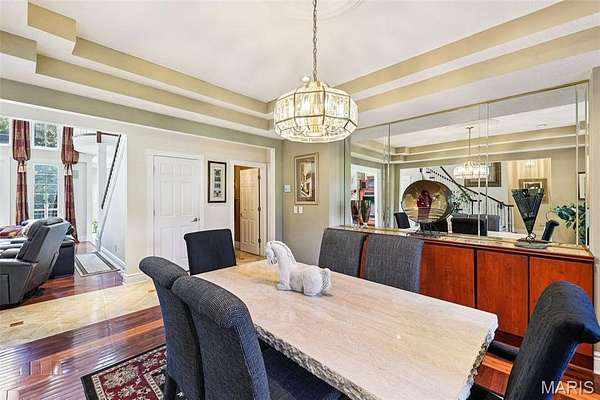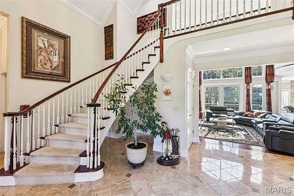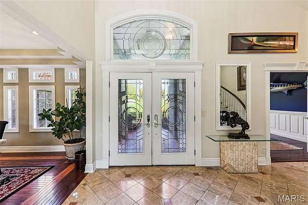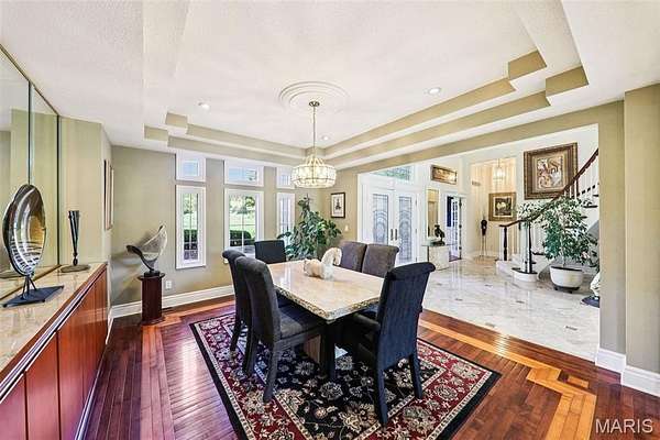 Inside, more than 3,500 square feet of thoughtfully curated living space unfolds beneath soaring ceilings, where hand-inlaid hardwood floors, intricate millwork, and three fireplaces create an atmosphere of warmth and quiet sophistication. The grand two-story foyer welcomes guests with a sweeping staircase and cascading natural light, setting a tone of elegance that carries throughout the home’s formal and informal living spaces.