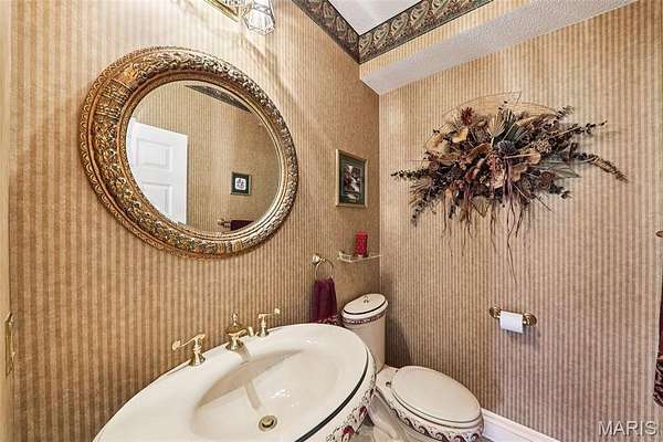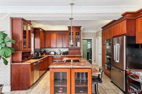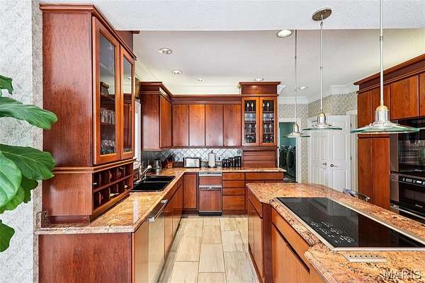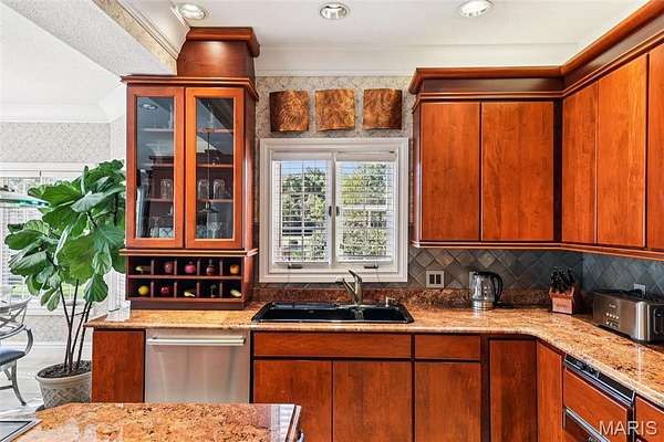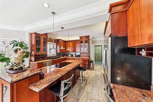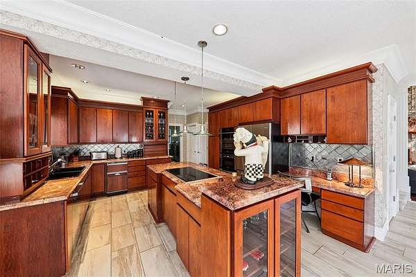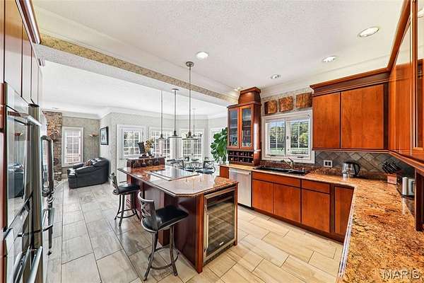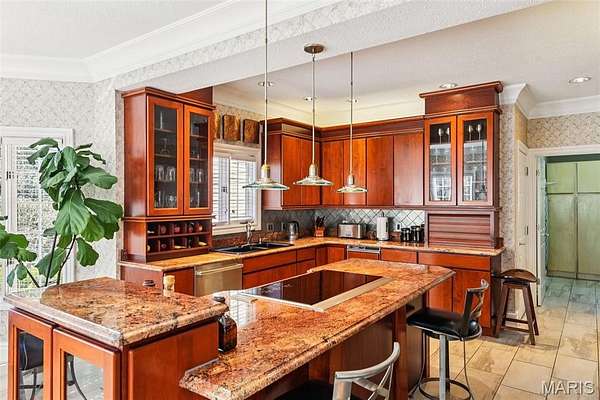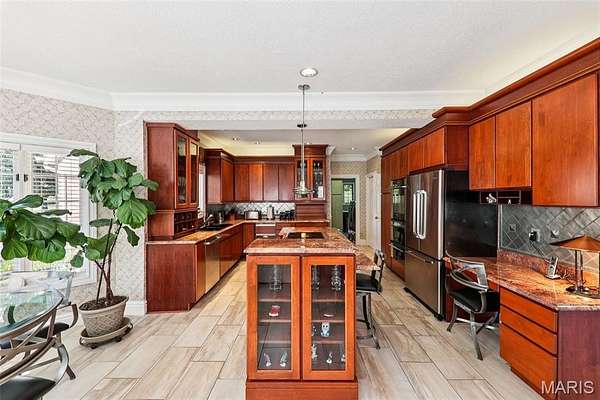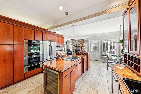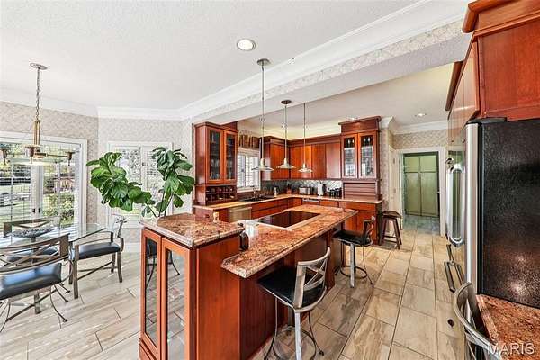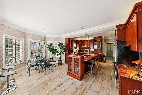 At the heart of the home, the chef’s kitchen balances functionality with style. Custom 42-inch cabinetry with crown molding rises above granite countertops and custom tile work, while premium appliances—including an induction cooktop, wall oven, warmer, and wine cooler—support effortless entertaining. A sun-filled breakfast room wrapped in bay windows offers tranquil views of the estate grounds beyond.