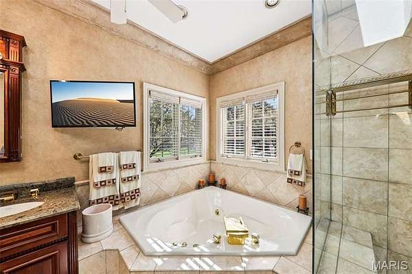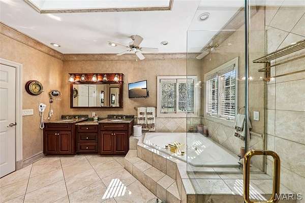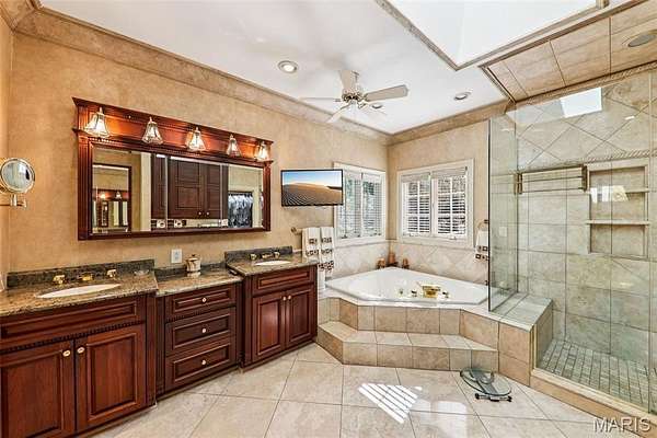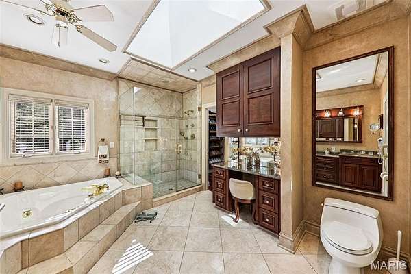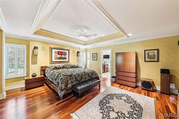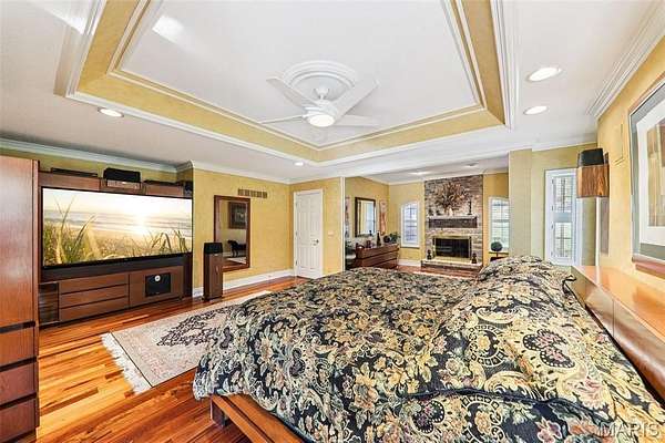 The main-level primary suite offers a retreat worthy of a private resort. Beneath a coffered ceiling, hardwood floors lead to a sitting area warmed by a second gas fireplace, while the spa-inspired bath features a soaking tub, separate shower, and dual vanities designed for everyday luxury.