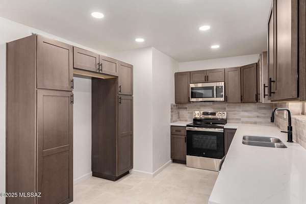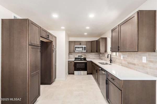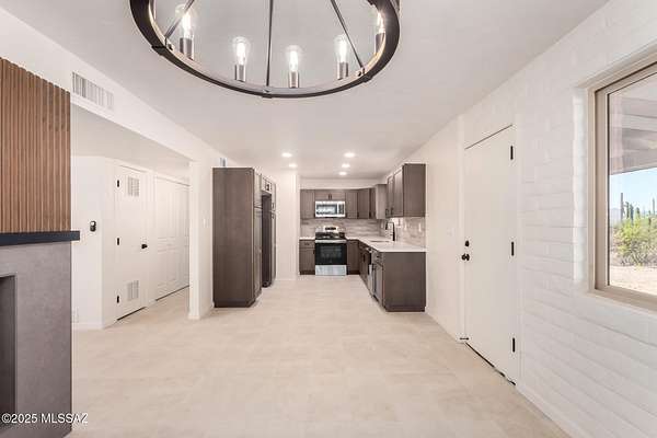 Beautifully Updated Ranch home 4.78 Acres in Coveted NW Tucson! Charming slump block ranch built in 1974, thoughtfully upgraded throughout. Enjoy 4.78 private acres with mountain views and room for horses, gardens, or future expansion. Interior features stylish 12x24 ceramic tile flooring and fresh paint. Gorgeous new kitchen with warm brown cabinetry, quartz countertops, stainless steel appliances, and modern plumbing and electrical fixtures. Bathrooms fully remodeled with new cabinets, quartz tops, elegant tile shower surrounds, and contemporary fixtures. Brand-new roof and exterior paint provide lasting quality and curb appeal. Experience modern comfort and timeless Tucson character in a peaceful Northwest setting close to shopping, dining, and schools. Move-in ready