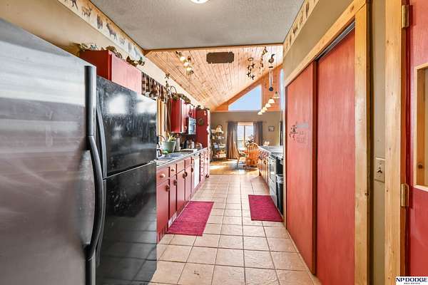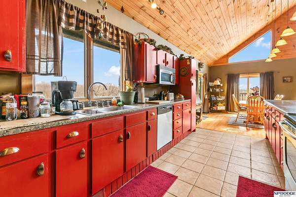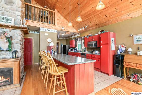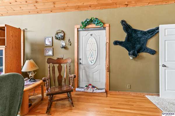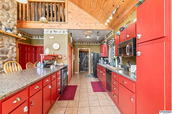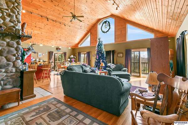 Lisa McGuire Kelly, M: 402-301-3204, lmkelly@npdodge.com, https://www.npdodge.com - Country Living in the City! Sprawling 3.82 Acre lot w/private paved driveway. One of a Kind LOG cabin home w/unique 1.5 Sty flr plan. Gorgeous Great Room w/ Cathedral Oak Ceilings, Massive wall of windows, 4 sliding glass doors, beautiful refinished wd flrs, tall stone chimney. Great room open to dining area/kit. Dining area surrounded w/windows & sliding glass doors w/wood flrs. Lg Kit w/ big breakfast bar, lots counter space, ample cabinets, SS appl, tile flrs & WI pantry. Mud rm w/closet, sink & tiled flrs. Main flr laundry. Spacious Primary Br w/WI closet, lg bath w/whirlpool tub, WI shower & tiled flrs. Airy 2nd flr has lg 2nd bedroom. Fully finished walkout bsmt includes: 3rd br w/daylight window, 4th non conforming br w/WI closet, 2nd full kit, FR, 3/4 BA, LVP, Slide glass drs. Wrap around deck. Large circular driveway w/lots of parking. HUGE 37x24 Metal Pole Barn w/electricity & separate drivew