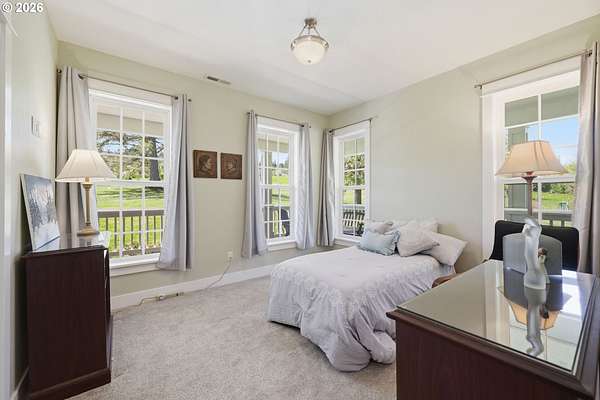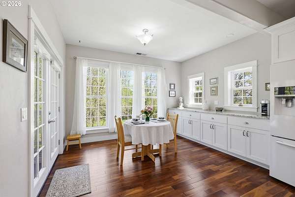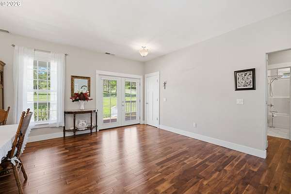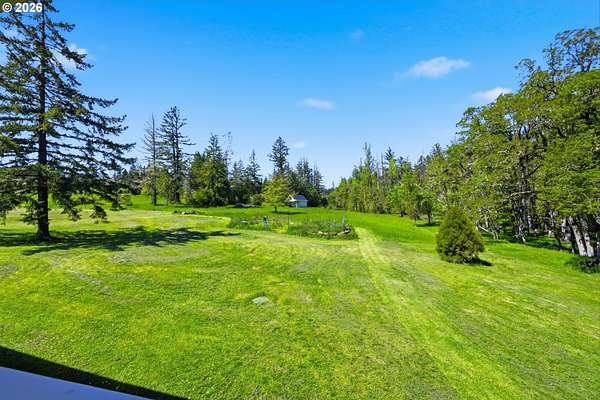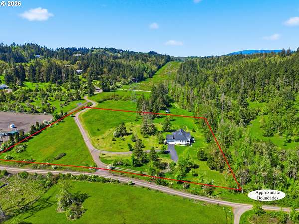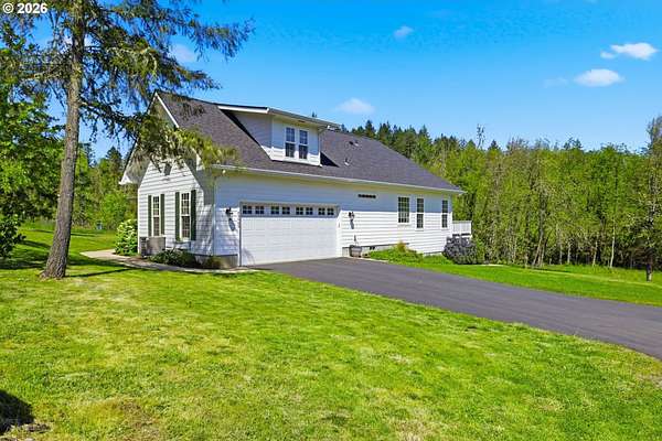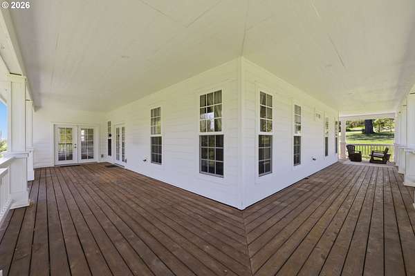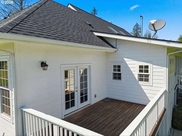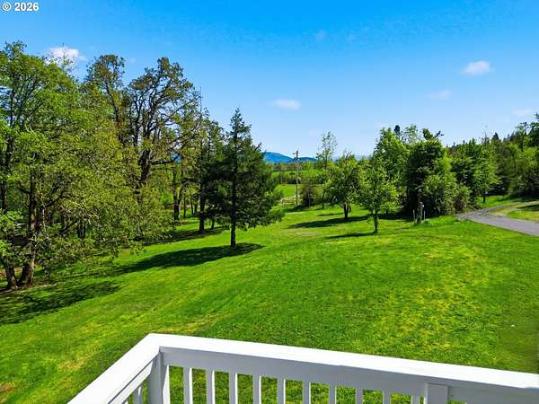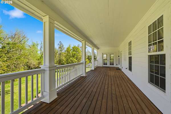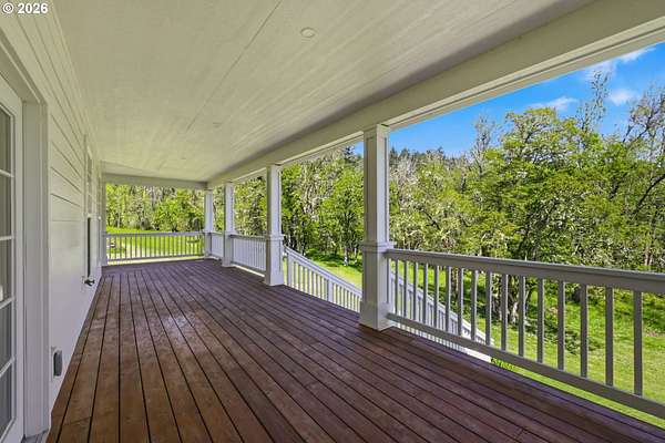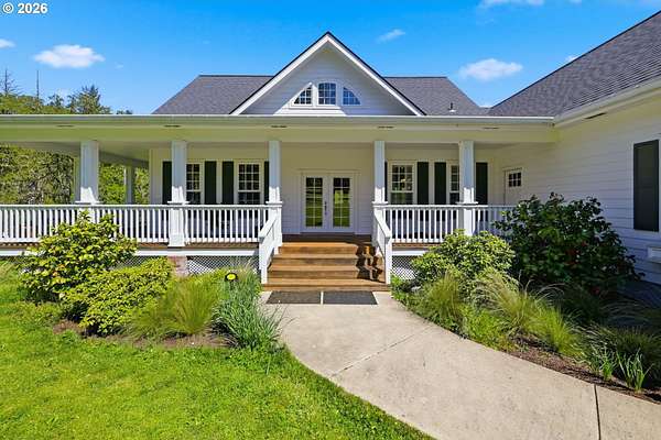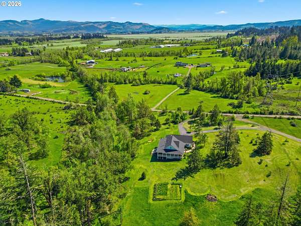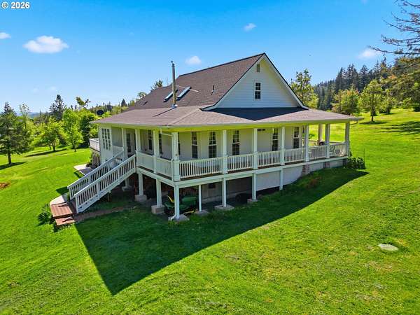 Stunning Modern Farmhouse features a classic wrap-around porch and light-filled interior. Mostly main-level living showcases exquisite acacia wood flooring, complemented by detailed molding on abundant windows and doors. The thoughtfully designed floor plan offers excellent separation between the guest rooms and the primary suite. The gourmet kitchen features a leathered granite peninsula, extra deep farm sink, timeless subway tile backsplash, and a convenient pantry with pull-out shelves. Adjacent to the kitchen, the bright breakfast room catches the morning sun and includes soft-close cabinetry, an extended granite counter, hill views, and French doors for easy outdoor access. The generous family room adds drama with a vaulted ceiling, skylights, tall windows, French doors, and woodstove. The Primary suite boasts a separate bathtub and shower, dual sinks, walk-in closet with built-ins, and French doors leading to its own deck with views of the nearby creek and hills. Each of the 2 1/2 bathrooms and the laundry room have porcelain tile flooring and granite counters. Up the wide staircase, enjoy the very private den/office which could easily function as a large 4th bedroom, if a closet was added. The 466 square foot unfinished stand-up attic offers wonderful storage and/or expansion possibilities. Architectural amenities include an Arched Window, Front Shutters, Attached Flower Boxes, Mature Landscaping, Fruit Trees, and a Fenced Garden. Walk-in storage space, approximately 40'x 11' under the home, has electricity, plywood "floor", small shop space, and insulation. There is even more storage space under the side and back of the wrap-around decks. Additional abutting 5.44-acre parcel, Ridgetop Lot 15, RMLS #24641325, is available, for a total of more than 11 acres. Don't miss this opportunity to experience life in a truly beautiful home in one of South Eugene's premier neighborhoods! Contact your broker today to view.